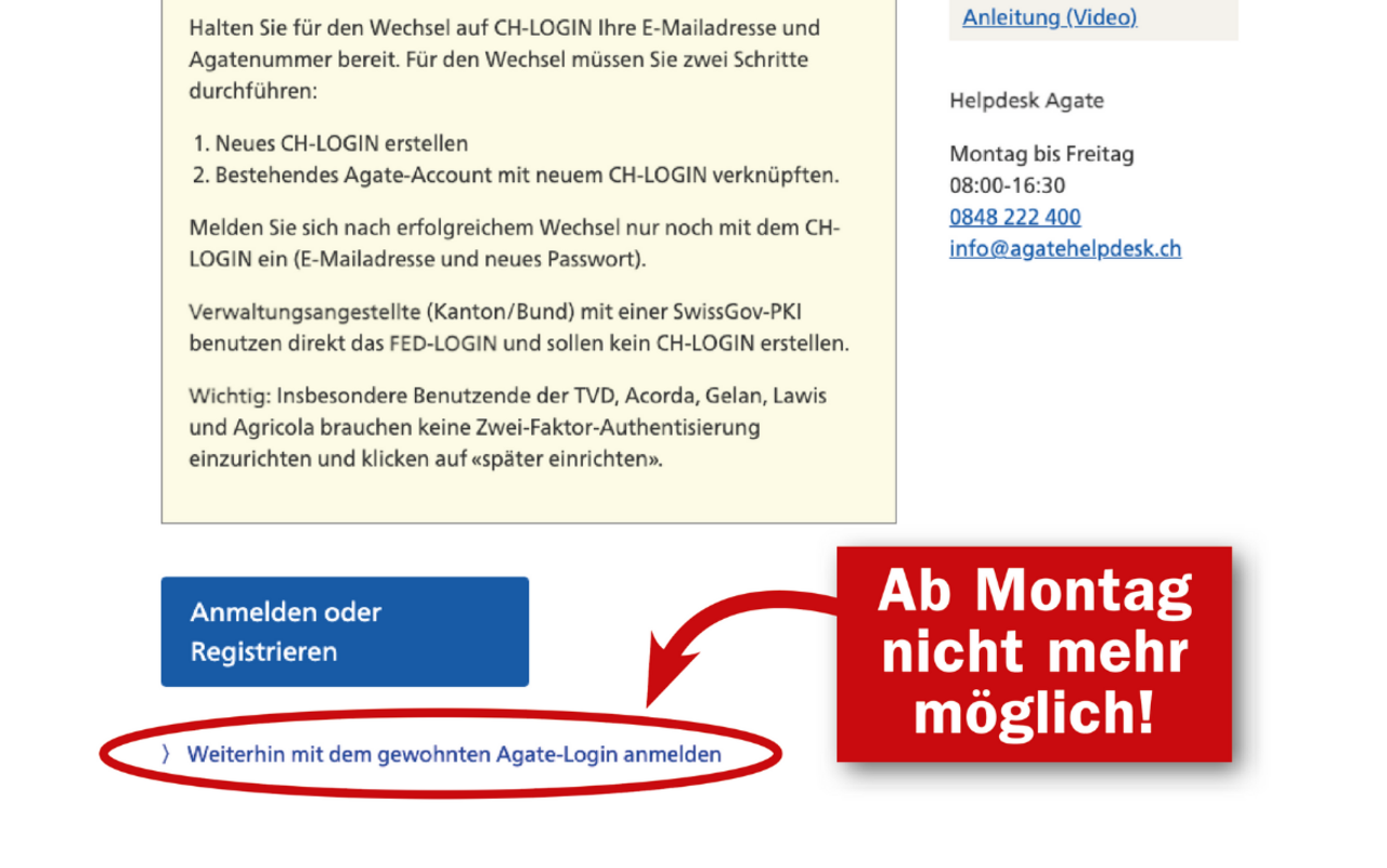Am Montag endet also die Übergangszeit. Ab dann ist das Anmelden mit dem alten Agate-Login nicht mehr möglich. Das heisst, beim nächsten Login wird eine Umstellung notwendig. Diese Umstellung kann demnach auch noch nach dem 17. Oktober vollzogen werden und ist bis auf weiteres möglich.