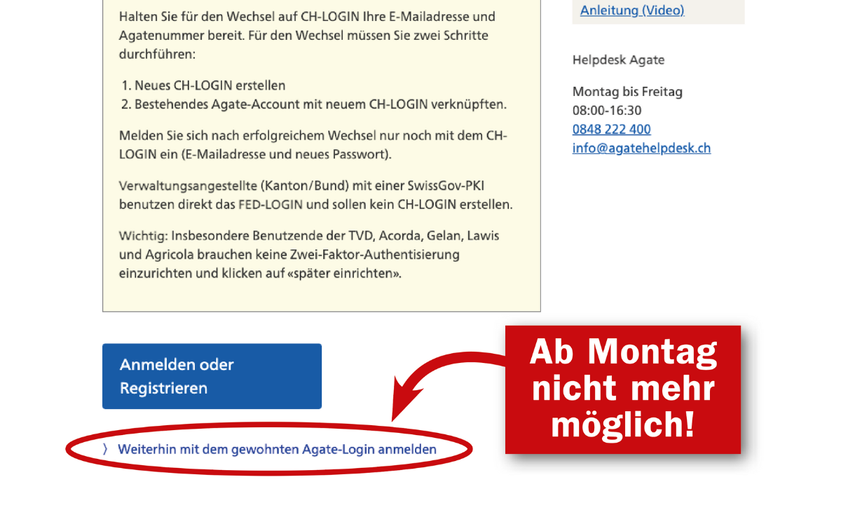 Am 27. April 2022 wurde Agate an das zentrale Anmeldesystem der Bundesverwaltung angeschlossen. Die Landwirtinnen und Landwirte, wie auch alle anderen Halter von registrierten Nutztieren, sind als Anwender des Online-Portals von diesem Schritt betroffen. «Mit dem rasanten technischen Fortschritt sind wir heute auf allerlei Anwendungen angewiesen und müssen uns dafür immer mehr Passwörter und Benutzernamen merken», heisst es beim Bundesamt für Landwirtschaft (BLW). Eben dieser Umstand wurde nun vereinfacht: Agate schloss sich dem Anmeldeverfahren (CH-Login) von eIAM an.