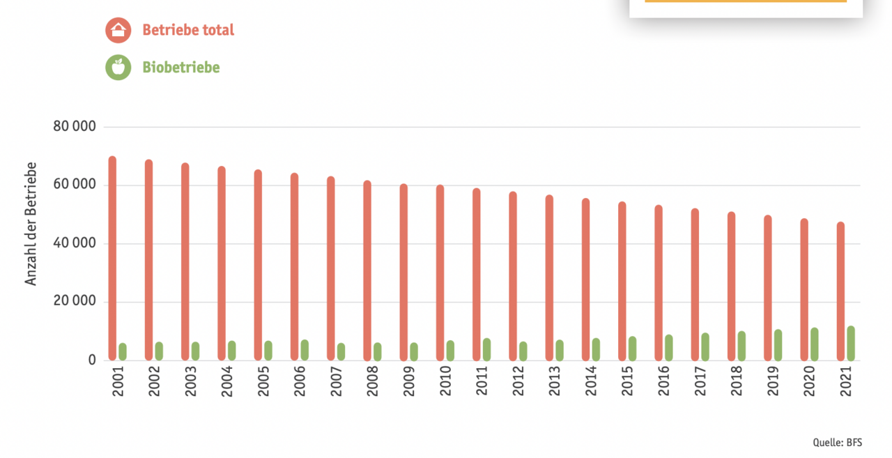 Die Zahl der Landwirtschaftsbetriebe sank 2021 im Vergleich zum Vorjahr um 1,0% auf 48'864. Der Rückgang lag damit unter dem Mittelwert der letzten fünf Jahre (-1,5 %). Die Zahl der Betriebe mit einer Fläche von 5 bis 20 Hektaren nahm um 2,8 % ab, jene mit einer Fläche von über 30 Hektaren hingegen um 1,3 % zu. Im Durchschnitt umfassten die Betriebe 21,3 Hektaren. 2021 gab es 7670 Bio-Betriebe, ein Plus von 1,4 % gegenüber dem Vorjahr.