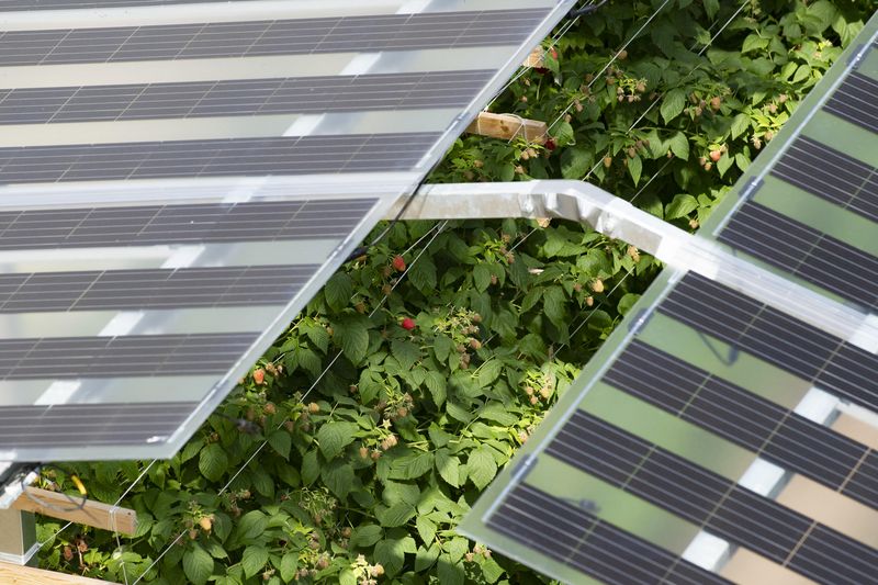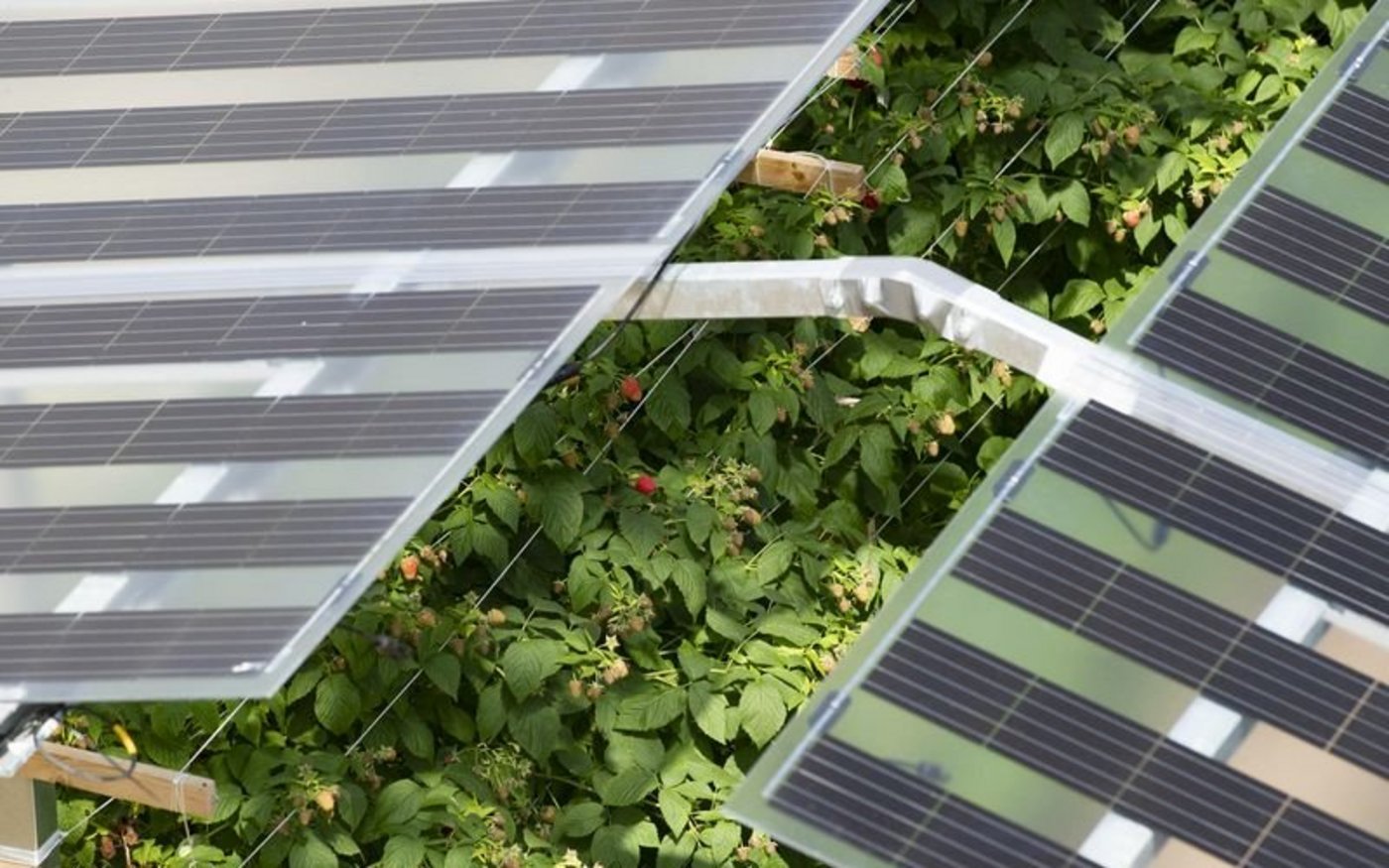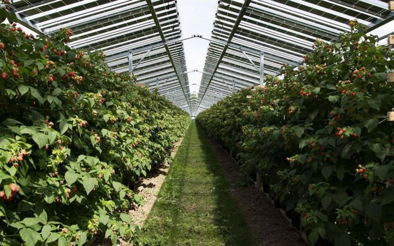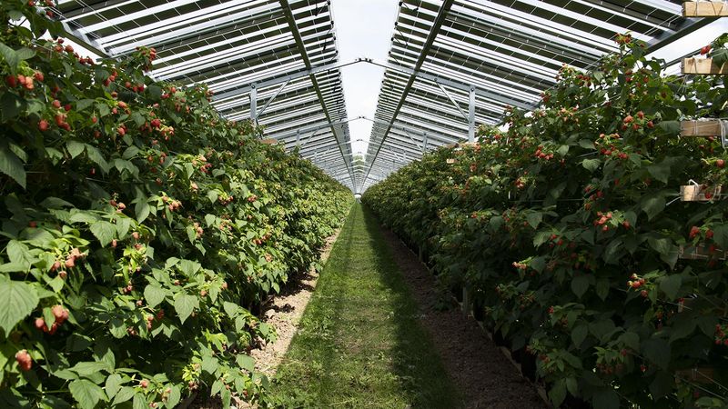 Im holländischen Babberich beispielsweise ersetzte Himbeeren-Produzent Piet Albers die Folien-Regendächer auf 3,3 Hektaren Flächen auf einer Höhe von 2,5 Metern durch 10’000 Solarmodule. Die semitransparenten Zellen lassen gerade genug Licht durch, damit die Himbeeren darunter ausreichend Photosynthese betreiben können.