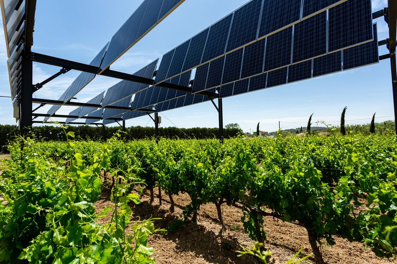 In Südfrankreich steht eine solche Anlage über 4,5 Hektaren Weinreben, die im Rahmen des französischen staatlichen APV-Förderprogramms Sun Agri erstellt wurde. Die Module werden zusätzlich unterstützt von Wetterdaten gesteuert. Wenn ein Starkregen naht, wechseln sie auf horizontal. Zudem arbeiten die Module zweiseitig, können also reflektierendes Licht vom Boden nutzen. Das erzeugt bis zu 13 Prozent mehr Stromertrag. Die gleiche Technologie mit beweglichen Modulen wird auch auf Gewächshäusern getestet.