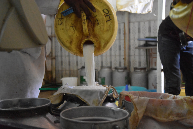 In gelben Plastikcontainern wird die Milch transportiert. Die ausgedienten Speiseöl-Behälter haben 5 bis 20 Liter Fassungsvermögen und können aufgrund der kleinen Öffnung nur schlecht gereinigt werden. Meist werden sie bloss mit Holzkohle ausgeschwenkt. Dies soll desinfizierend wirken und ist die einzige Option bei Wassermangel im Busch. Es verleiht der Milch allerdings auch einen rauchigen Geschmack, den die Somalis lieben. Zusätzlich sind die gelben Container während des Transports zur Molkerei hohen Temperaturen ausgesetzt. Trotzdem wird die Milch nie pasteurisiert, denn die Somalis fürchten, dass beim Erhitzen wertvolle Nährstoffe kaputtgehen (siehe Textbox). Einzig das Ansäuern der Milch ist eine vielfach praktizierte Methode, die die Haltbarkeit erhöht. Aber auch da fehlt eine professionelle Durchführung: die saure Milch entsteht einfach, wenn die Milch zu lange nicht gekühlt wurde. Von den Konsumenten in Nairobi wird die Milch frisch, gesäuert oder angereichert mit Gewürzen und viel Zucker als Kamel-Chai genossen.