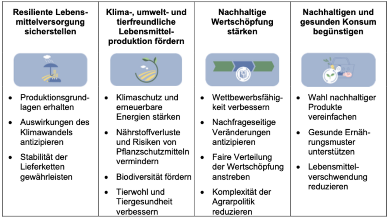 Landwirtschaft: Netto soll die Inlandproduktion mehr als zur Hälfte zur Versorgung der inländischen Bevölkerung beitragen, dabei bodenabhängig oder -unabhängig aber standortangepasst arbeiten. Die Wertschöpfung pro Arbeitskraft soll gegenüber 2020 um 50 Prozent steigen, die Fruchtfolgeflächen sollen netto nicht zurückgehen und rund 1/6 der LN als BFF genutzt werden. Der Ackerbau sei auf Kulturen für die menschliche Ernährung auszurichten (Alternativen im Rahmen der Fruchtfolge ausgenommen). Wiederkäuer zur Nutzung des Dauergrünlandes und von Nebenprodukten aus der Lebensmittelherstellung.