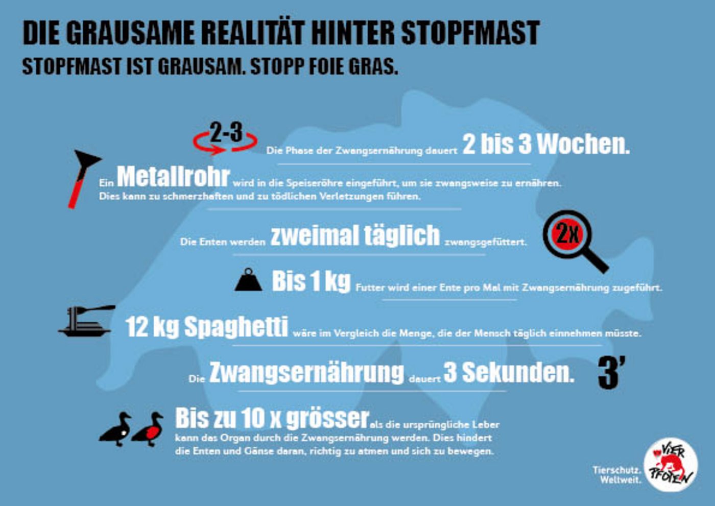 Die Tierschutzorganisation Vier Pfoten äusserte sich in einer Mitteilung erfreut über den Entscheid. Die Stopfmast ist hierzulande seit über 40 Jahren verboten, dennoch würden jedes Jahr fast 200 Tonnen Stopfleber importiert, was die Schweiz zu einem der weltweit grössten Importländer dieses als Delikatesse geltenden Produkts macht, schreibt Vier Pfoten.