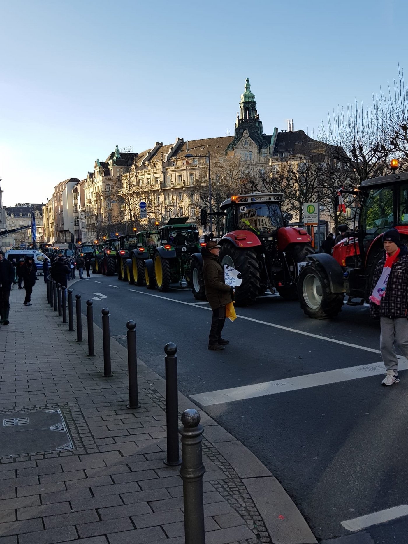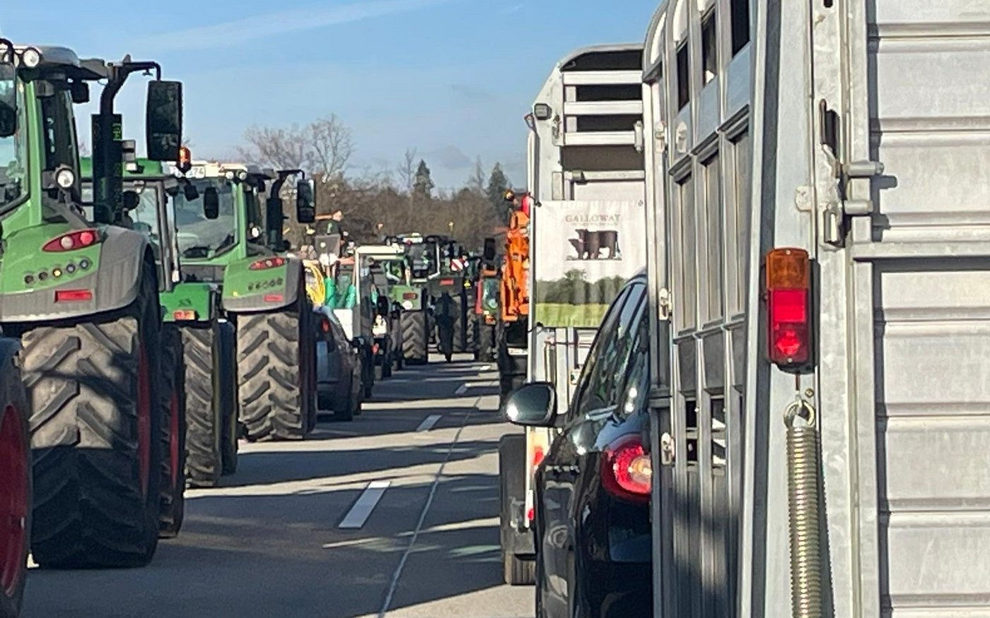 «Es ist ein Wahnsinn, was hier alles los ist», sagt Landwirt Arno Molter aus Hessen. Er hätte nie gedacht dass es so viele Traktoren geben würde. «Auch ganz viele andere Unterstützer sind im Konvoi, wie Handwerker, LKW und und und.»