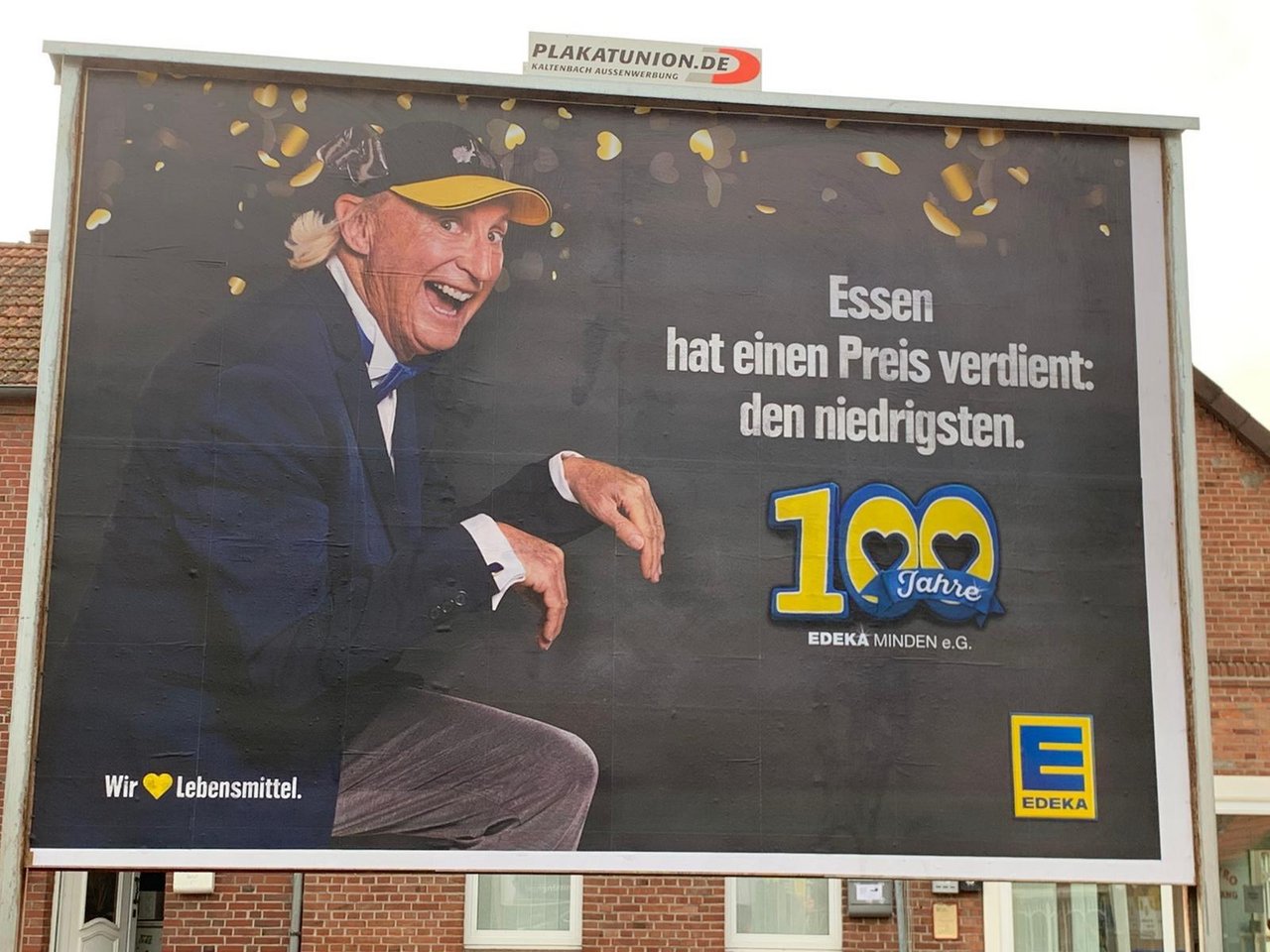 Der Protest der Landwirte richtete sich gegen den Edeka-Verbund, einen der führenden Lebensmittelhändler in Deutschland. Edeka wirbt mit dem Slogan "Wir lieben Lebensmittel". Zum 100-jährigen Jubiläum in der Stadt Minden lancierte der Verbund eine neue Werbung mit dem Komiker Otto Waalkes. Der Spruch dazu kam bei den Landwirtinnen und Landwirten aber gar nicht gut an: "Essen hat einen Preis verdient: den niedrigsten".