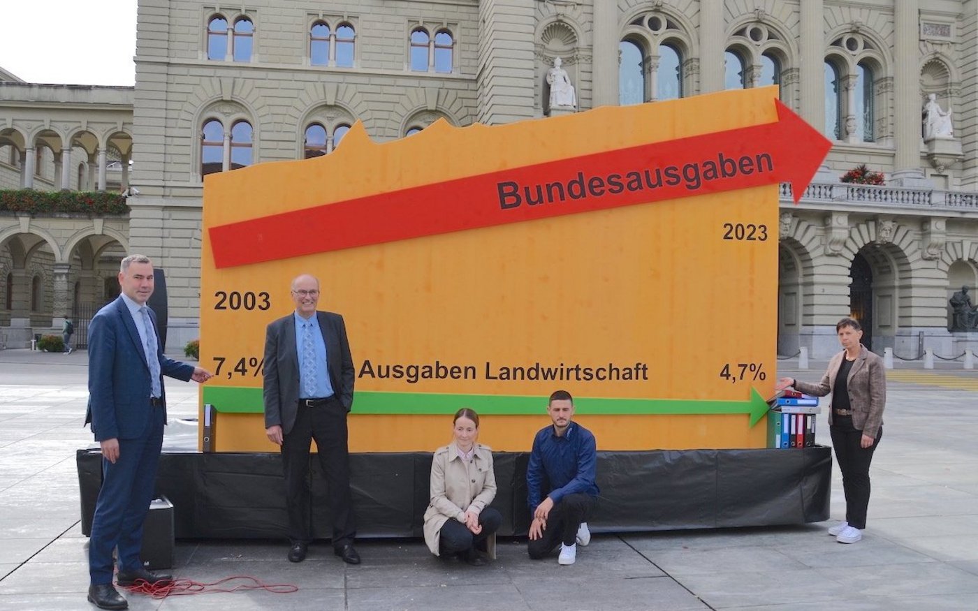 «Wenn alle Ausgabenbereiche so sorgsam mit ihren Mitteln umgegangen wären wie die Landwirtschaft, dann hätten wir auf Bundesebene einen riesigen Überschuss von 40 Milliarden Franken», stellte Martin Rufer klar. Der Direktor des Schweizer Bauernverbandes (SBV) erläuterte auf dem Bundesplatz, wie die Landwirtschaft dreifach von den Sparplänen zur Behebung des Bundes-Finanzlochs betroffen ist: