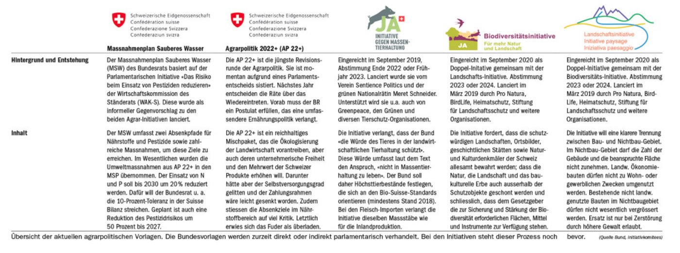 Die Verschnaufpause nach dem klaren, doppelten Nein zu den Agrar-Initiativen vom 13. Juni war nur kurz. Es geht agrarpolitisch unvermittelt und in hohem Tempo weiter. Nicht weniger als fünf Vorlagen liegen auf dem Tisch und sind teilweise bereits in Bearbeitung, wie die folgende Tabelle zeigt. Die fünf Vorlagen in der Pipeline [IMG 2] Mässige Begeisterung Derzeit läuft die noch bis zum 18. August die…