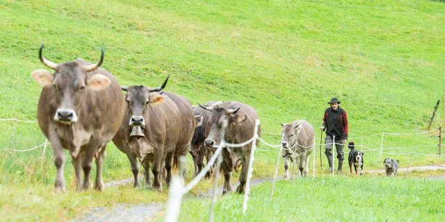 Hornkühe sind mit höheren Kosten verbunden. Da diese aber primär beim Stallbau anfallen, sollte auch eine mögliche Unterstützung dort ansetzen, findet Bänz Stalder. Er würde diese eher bei den Landschaftsqualitätsbeiträgen ansiedeln, als im politisch aufgeladenen Tierwohl-Bereich. Ausserdem komme es auf die Höhe der Zahlungen an: «Ein Franken wäre zu viel und unfair gegenüber Landwirten mit einer hornlosen Herde», findet er. Idealerweise könnte man mit Hornkuh-Produkten auch einen höheren Preis erzielen. Der Landwirt bezweifelt aber, dass Kunden den Hofladen der Pfandersmatt vor allem der Hörner wegen bevorzugen. «Allerdings stellen wir immer wieder fest, dass Besucher unsere würdevollen Hornkühe bewundern und es wertschätzen, dass unsere Tiere ihre Hörner behalten dürfen.»