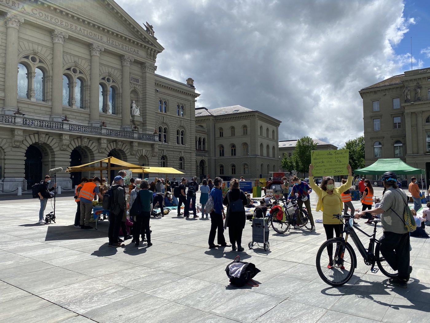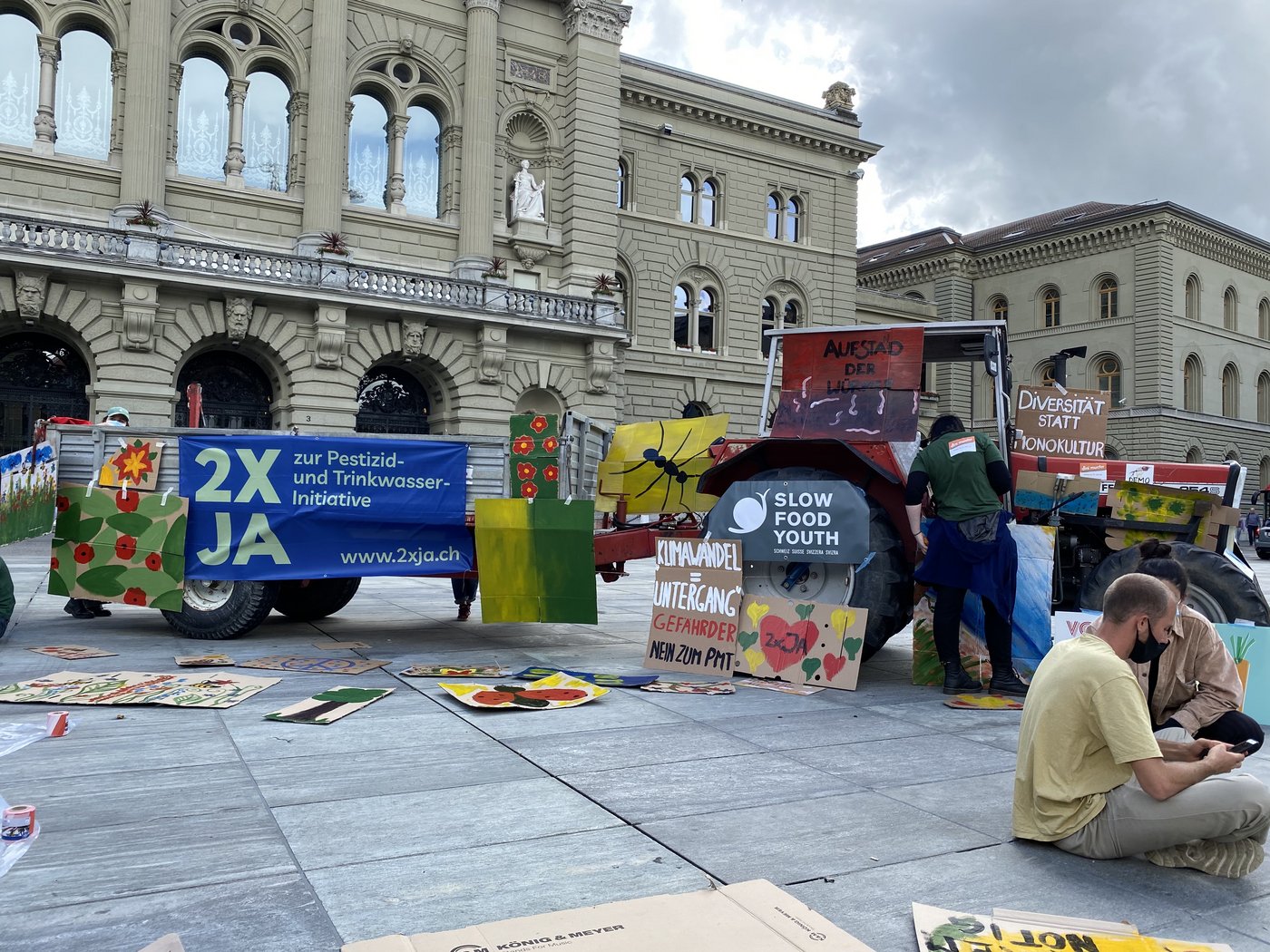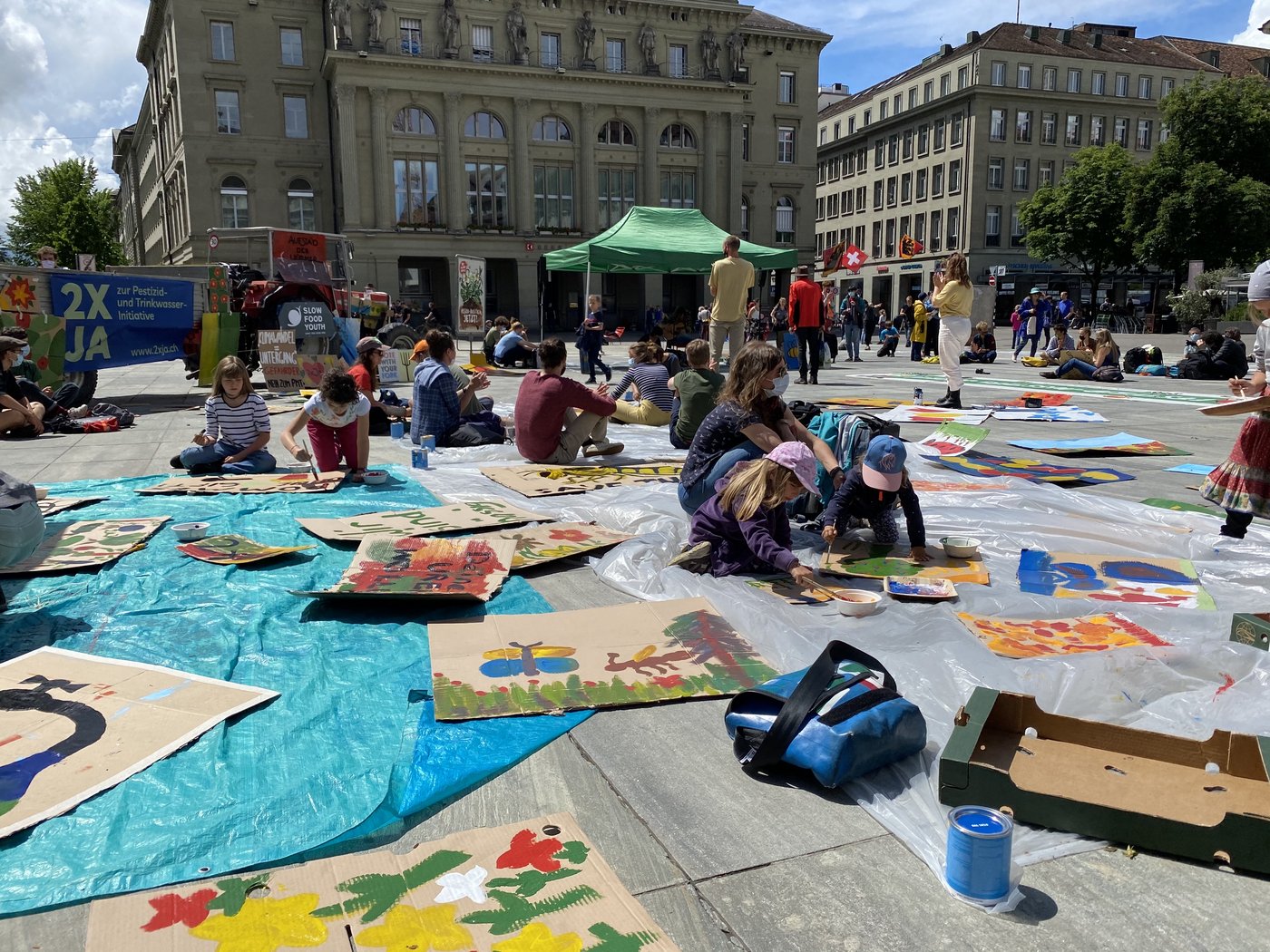 Unter dem Slogan «Zeit für einen Aufbruch» hatten die Organisatorinnen und Organisatoren dazu aufgerufen, ein buntes Zeichen auf dem Bundesplatz zu setzen. Mit einem Riesenbild verliehen sie ihrer Forderung nach einem sofortigen «Pestizid-Ausstieg» eine optische Gestalt, während eine Live-Band musikalisch für Stimmung sorgte. «Landwirtschaft mit Zukunft» versteht sich sowohl als Organisation als auch als Bewegung. Ins Leben gerufen wurde die Gruppierung vor allem durch junge Aktivistinnen und Aktivisten aus dem Umfeld der Klima-Bewegung. Wie die Organisation auf ihrer Website schreibt, vereint sie Menschen mit unterschiedlichsten Hintergründen, deren gemeinsames Ziel eine «soziale, bäuerliche und agrarökologische Landwirtschaft» ist.