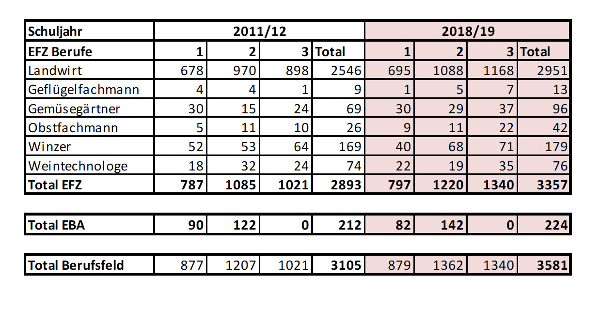 Laut einer Medienmitteilung geht der Aufwärtstrend bei den Lernendenzahlen im Berufsfeld Landwirtschaft weiter. Im aktuellen Schuljahr machen 3581 Personen eine Grundbildung in einem der landwirtschaftlichen Berufe. Dies sind 476 mehr Lernende als noch vor sieben Jahren. "Die Rekordzahlen letztes Jahr waren ein Ausreisser, der Trend ist jedoch ungebrochen" gibt Martin Schmutz vom Bauernverband bekannt.