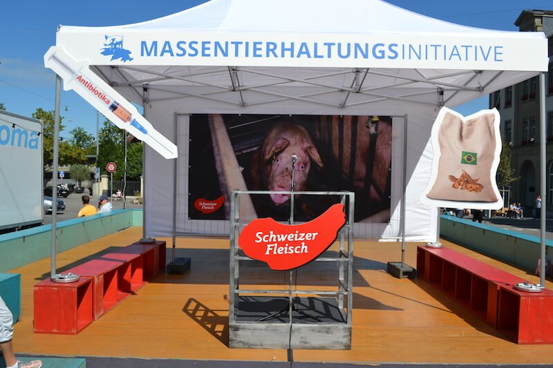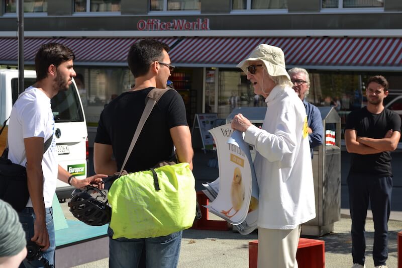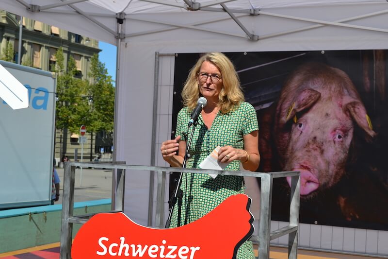 Es war ein Schaulaufen diverser Organisationen in der prallen Sonne auf dem Berner Waisenhausplatz. Tierrechtsorganisationen (Schweizer Tierschutz STS, Animal Rights, Tier im Fokus), Politiker (Junge Grüne, Piratenpartei) und Veganer-Botschafter hatten sich versammelt. Letztere wurden jedoch von Meret Schneider von Sentience Politics (den Initianten) weggeschickt – dies sei keine Veganer-Initiative, stellte sie auf Anfrage klar.
