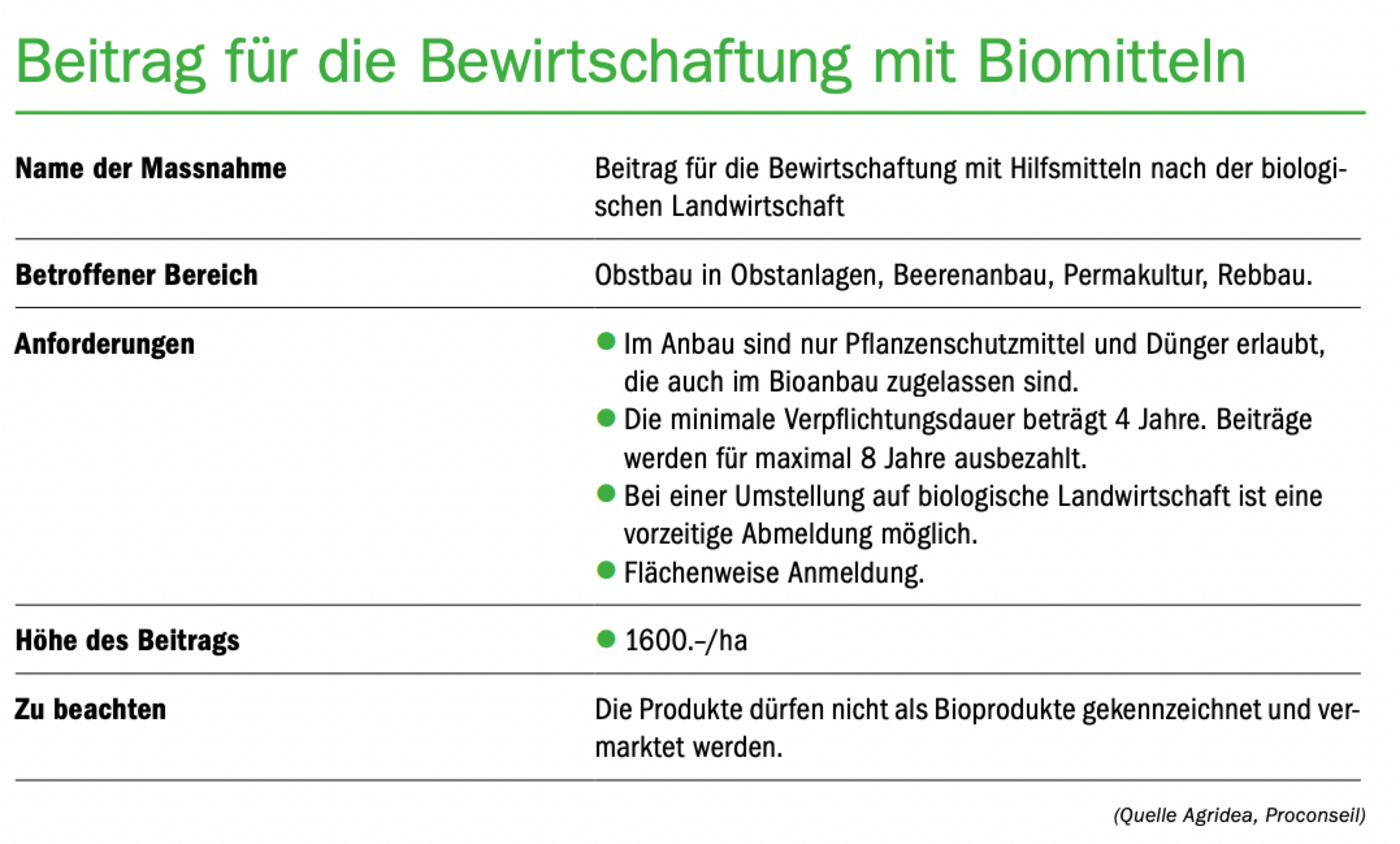 Die Senkung des Basisbeitrags von Fr. 300.–/ha betrifft auch die Dauerkulturen. Das Umsetzen der neuen Massnahmen zur Reduktion von PSM kann diese Senkung allerdings wieder ausgleichen. Der aktuelle Ressourceneffizienzbeitrag «Präzise Applikationstechnik», welcher die Anschaffung von neuen drift-mindernden Spritzgeräten unterstützt, wird bis Ende 2024 weitergeführt. Mehrere freiwillige Beiträge für mehrjährige Obst- und Beerenkulturen werden per 2023 neu eingeführt. Diese Beiträge werden in der Tabelle auf dieser Seite vorgestellt. Der Beitrag für Nützlingsstreifen wird in einem separaten Artikel vorgestellt.