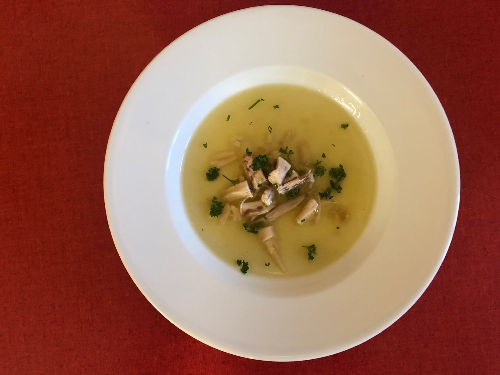 Vorbereiten: zirka 30 Minuten Kochzeit: 3–5 Stunden Für 6–8 Personen als Vorspeise Zutaten grosse Pfanne mit Deckel, zirka 6 l Fassungsvermögen 1 Suppenhuhn 4 Rüebli, gross, ungeschält 1/2–1 Knollen-Sellerie, je nach Grösse, geschält 2 Stangen Sellerie, inklusive Kraut 1/2–1 Wirz, je nach Grösse 1 Zwiebel, solche mit brauner Haut haben mehr Geschmack Kräuter, wie Peterli und Thymian 1–2 Lorbeerblatt 3…