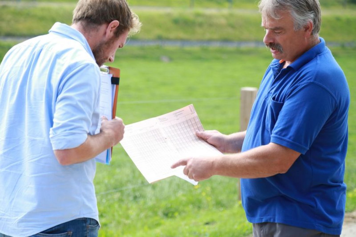 Marcel von Ballmoos kontrolliert das Auslaufjournal von Hugo Emmenegger. Sind die Kühe tatsächlich wie gefordert 26-mal pro Monat draussen? (Bild ji)