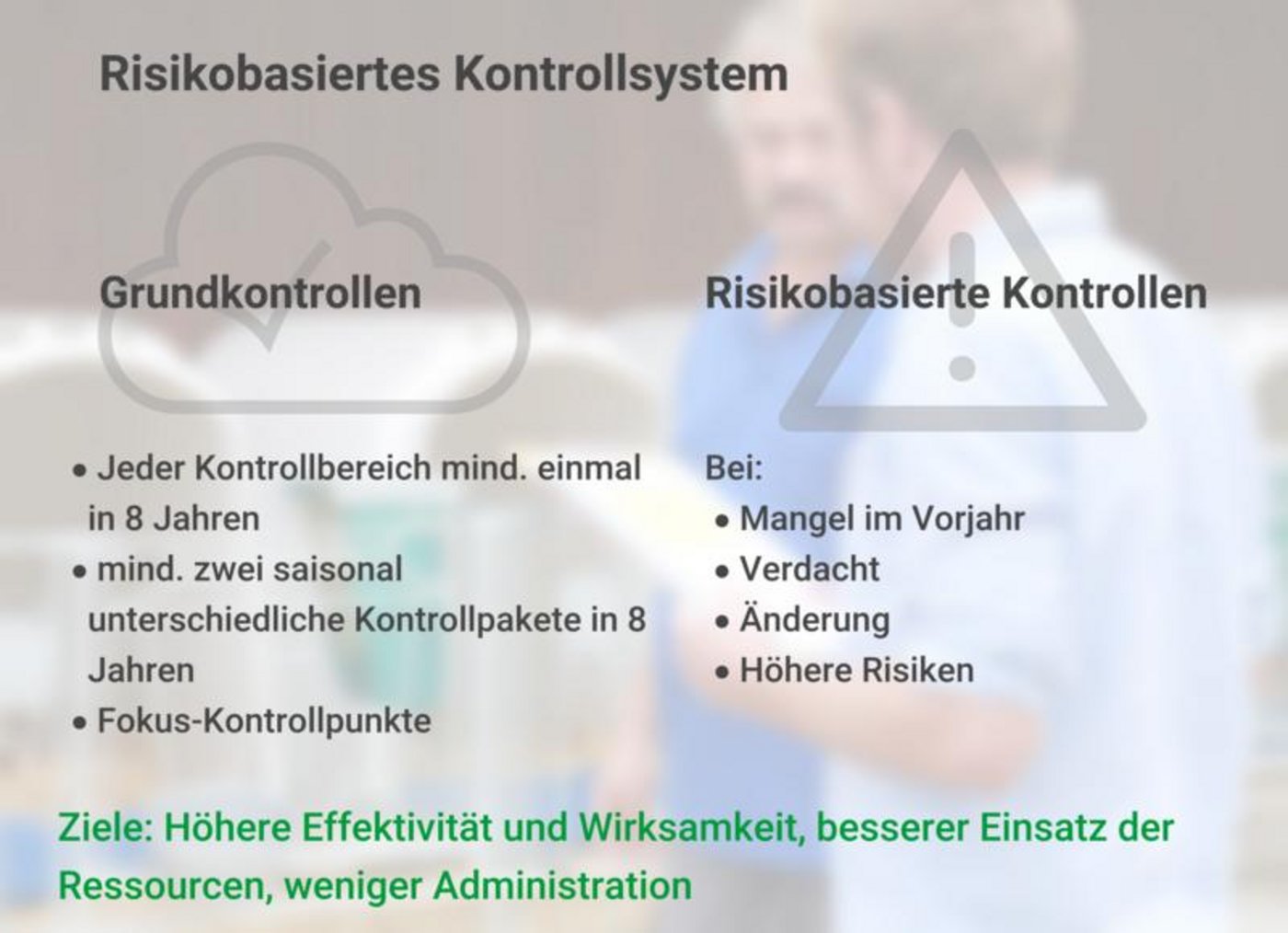 Bei den Grundkontrollen wird jeder Betrieb, der Direktzahlungen bezieht, regelmässig kontrolliert. Bei den risikobasierten Kontrollen werden hingegen gezielt Betriebe ausgewählt, die gewissen Risikokriterien entsprechen. Dabei kann es sich um Höfe handeln, bei denen bei früheren Kontrollen Mängel entdeckt worden waren oder ein begründeter Verdacht besteht. Hinzu kommen Änderungen im Betrieb oder solche mit höheren Risiken. Dabei kann es sich etwa um grosse Milchviehbetriebe handeln, die am RAUS-Programm teilnehmen, welches hohe Anforderungen umfasst. Das BLW legt jährlich Bereiche mit höheren Risiken fest. 2020 sind dies Erosionsschutz und Begrünung, Pflanzenschutz, Pufferstreifen sowie Weideflächen beim Regelmässigen Auslauf im Freien (RAUS). Bei letzterem handelt es sich um ein freiwilliges Tierwohlprogramm.