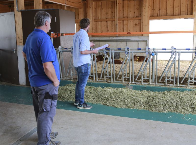 Auf der Rütti geht es nun nicht mehr um eine Gesamtkontrolle, sondern darum, ob der Betrieb die Anforderungen RAUS erfüllt. Von Ballmoos macht mit Betriebsleiter Emmenegger einen Stallrundgang. Im Fachgespräch erfährt er, wie der Landwirt die Kühe hält und wie es um deren Gesundheit steht. Von Ballmoos hört zu und schaut sich genau um, damit ihm allfällige Mängel nicht entgehen. Wichtig ist bei der RAUS-Kontrolle unter anderem, dass der Betrieb tatsächlich genügend Weideland besitzt. Auf der Rütti ist das kein Problem, Emmeneggers Kühe verfügen über ein vielfaches der benötigten Fläche.