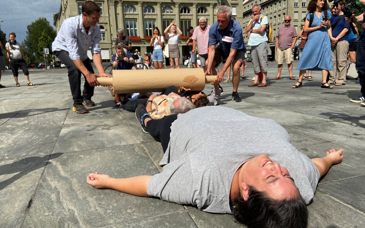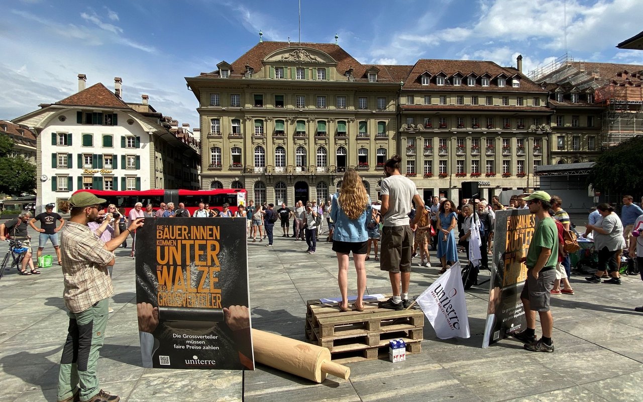 «BäuerInnen kommen unter die Walze der Grossverteiler» heisst es auf dem Plakat, das Uniterre am Donnerstag vor den Medien und rund hundert Demonstrantinnen präsentierten und auch gleich nachspielte. Mit einem überdimensionierten Wallholz überrollten je ein fingierter Migros- und Coop-Vertreter am Boden liegende Bäuerinnen und Bauern.