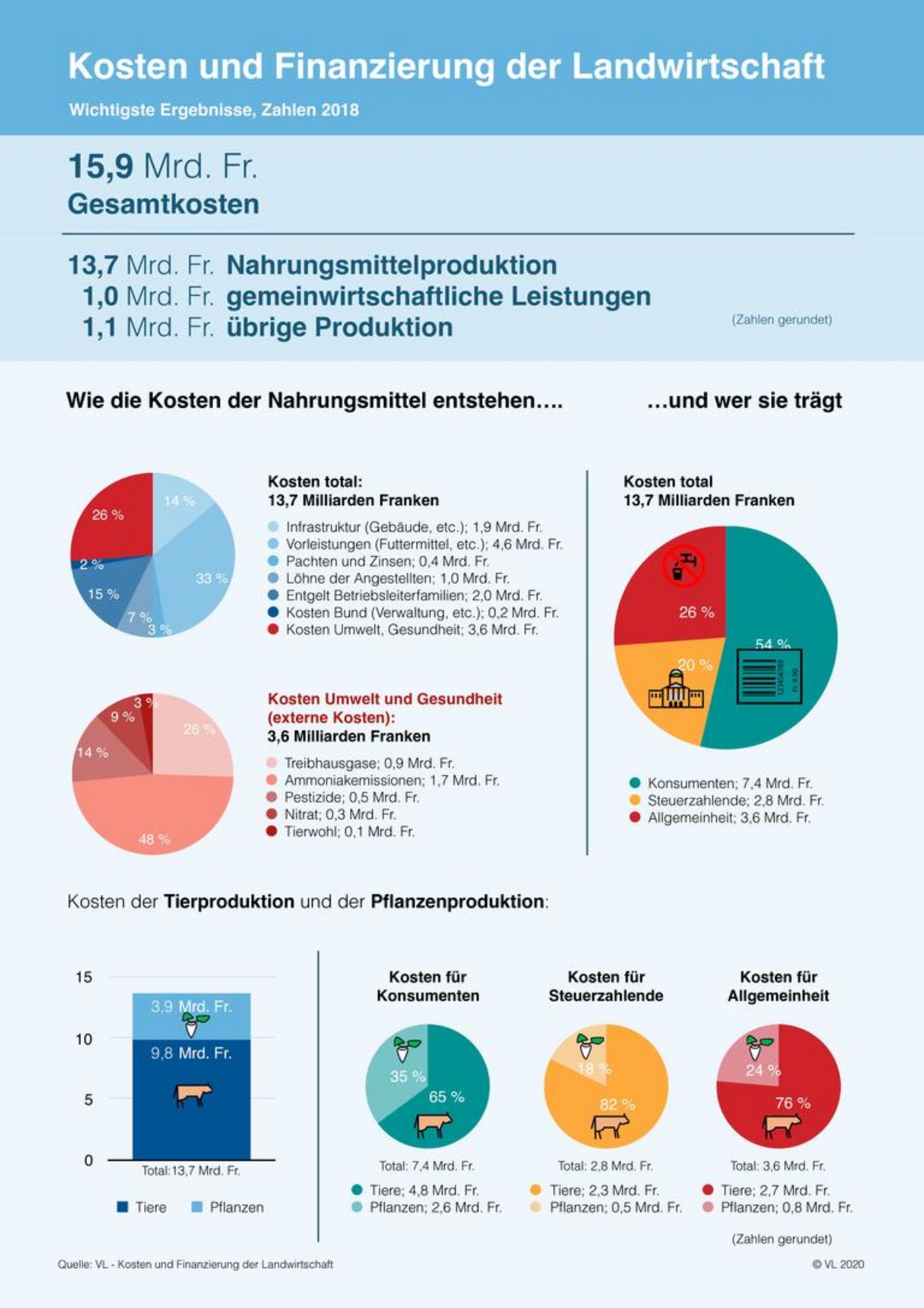 Für Vision Landwirtschaft ist klar, dass die Konsumentinnen und Konsumenten die gesamten Kosten für Nahrungsmittel tragen sollten. Es solle aber auch Ausnahmen geben: Bei Produkten, deren Produktion besonders nachhaltig sei oder deren Konsum aus «gesundheitspolitischer Sicht angezeigt ist». Heute definiert Vision Landwirtschaft in einer Studie zur Vollkostenrechnung der Landwirtschaft drei Kostenträger: