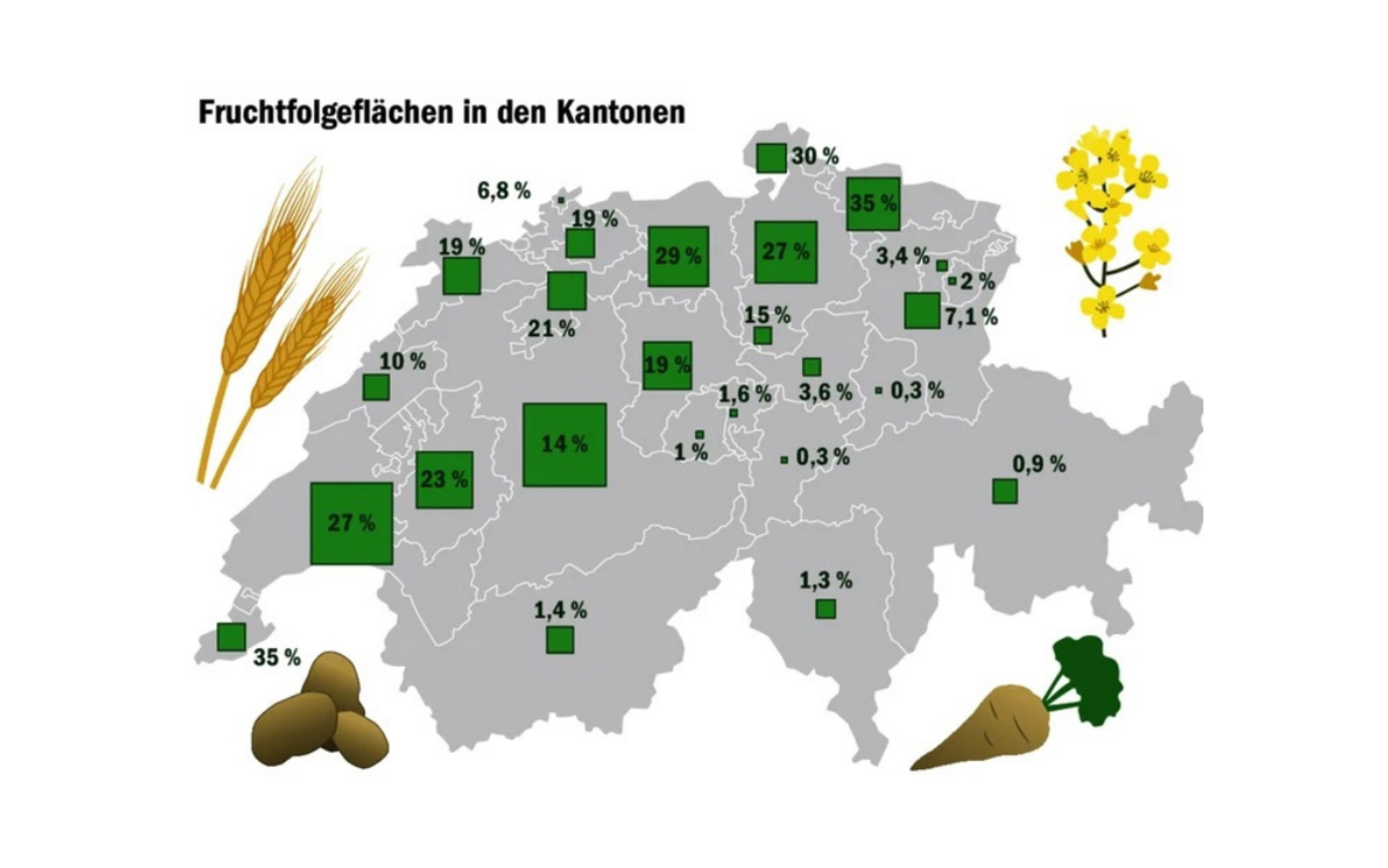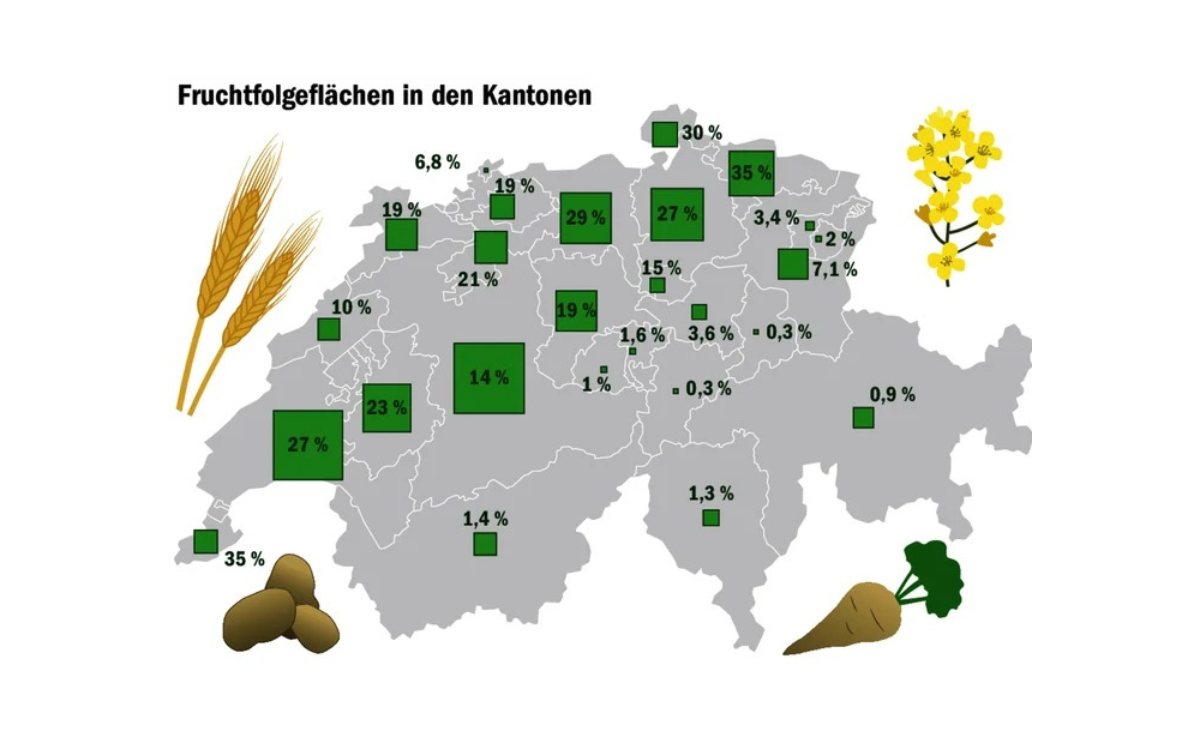 [REL 1]Alle Kantone haben einen Anteil Fläche, den sie für den Anbau von Getreide, Raps, Zuckerrüben und Kartoffeln freihalten müssen. Diese Flächen dürfen weder überbaut noch versiegelt werden. Die Grösse der Quadrate zeigt auf, wie gross die Fruchtfolgeflächen im jeweiligen Kanton sind. Die Prozentzahl sagt aus, wie viel von der Kantonsfläche das ist. Beispiel Kanton Bern: 14 % der Kantonsfläche sind als…