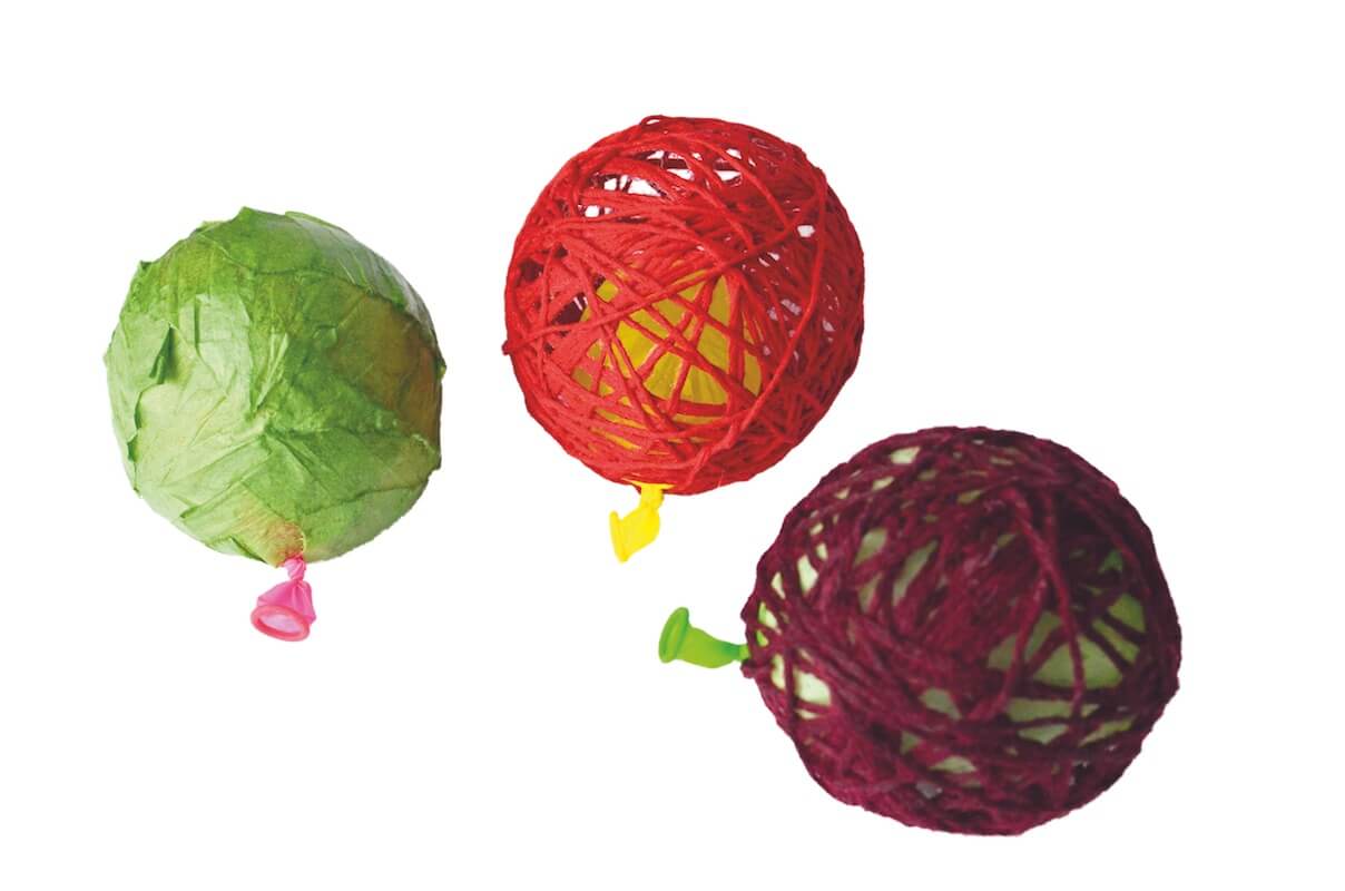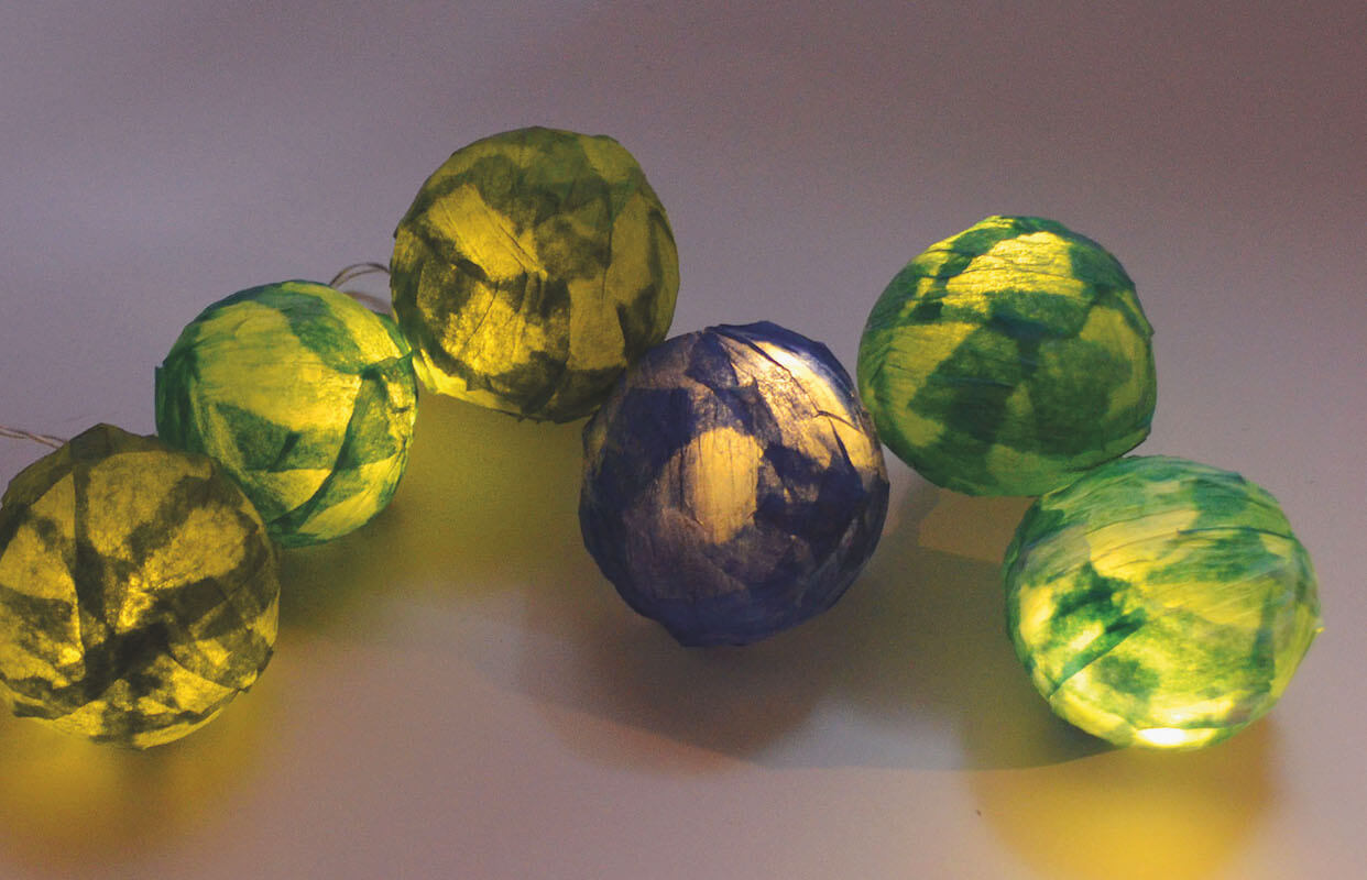 Statt Schnur dünnes Seidenpapier verwenden (zum Beispiel finnisches Papiergarn). Dieses reisst du in kleine Stücke und klebst es in zwei bis drei Lagen auf den Ballon. Er muss ganz umwickelt sein, damit die Hülle stabil wird. Das Papier mit Kleister bestreichen und auf den Ballon legen. Mit den Händen glatt streichen. Eine zweite Lage Papier auflegen und einkleistern. Alles glatt streichen und trocknen lassen. Dann schneidest du ein kleines Loch, stichst dort den Ballon kaputt und ziehst ihn raus. Durch diese Öffnung kannst du das Lämpchen stecken. Hänge deine Lichterkette in einen trockenen Bereich deines Gartens oder in deinem Zimmer auf.
