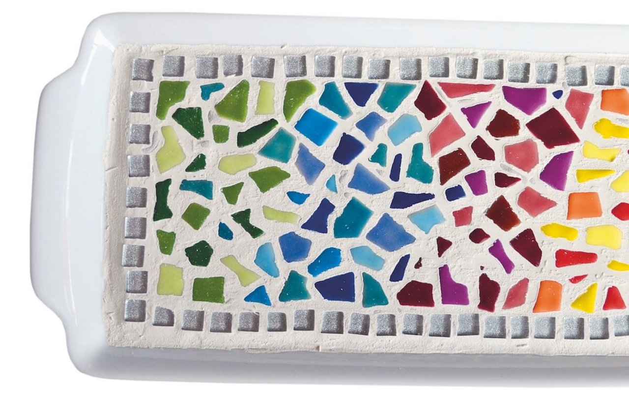 Such dir eine passende Unterlage, zum Beispiel eine Kuchenplatte. Leg zuerst deine Mosaiksteine auf die Platte um zu sehen, wie du das Muster ungefähr machen willst. Du kannst auch ein Papier mit den gleichen Massen vorbereiten und das Mosaik dort auslegen. Bestreiche im Anschluss deine Unterlage dünn mit dem Plättlikleber. Drück deine Mosaiksteine vorsichtig in die Masse, damit sie sich gut mit dem Kleber verbinden.