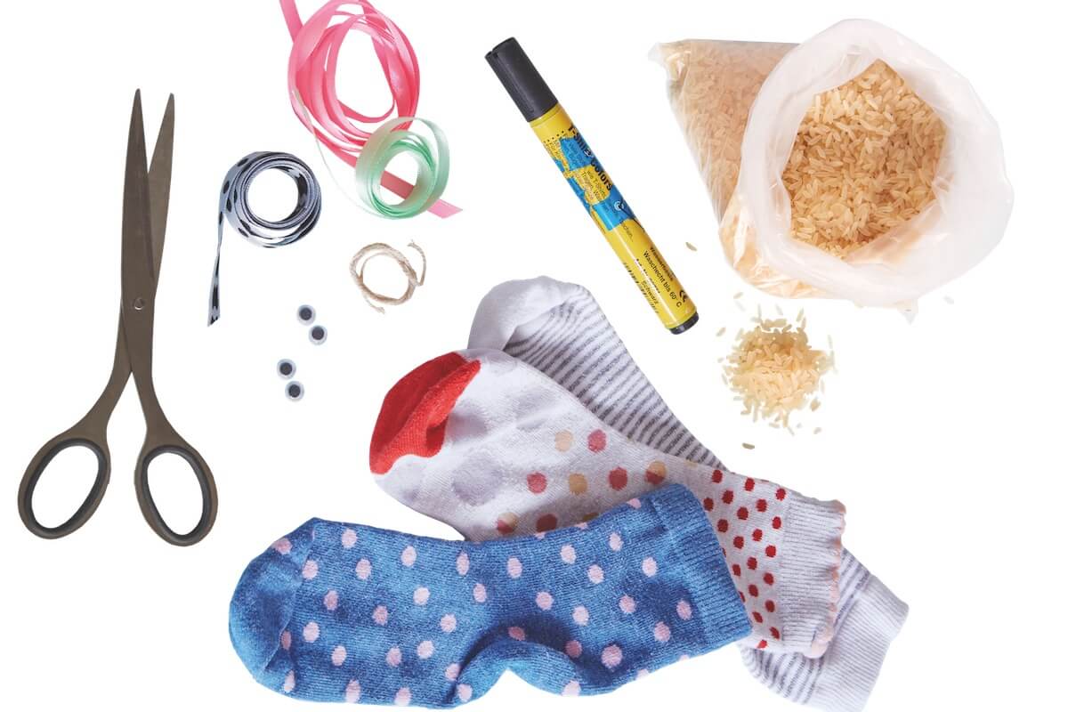 1. Die Socken etwa zu zwei Dritteln mit Reis füllen. Den oberen Teil gut mit Garn abbinden und etwa zu zwei Dritteln mit Reis füllen. Das obere Drittel mit mehreren Schichten Sternlifaden abbinden.