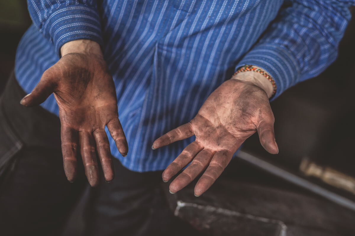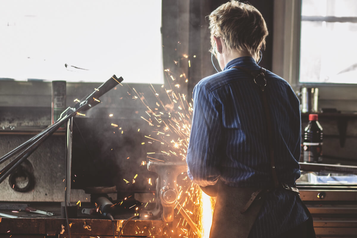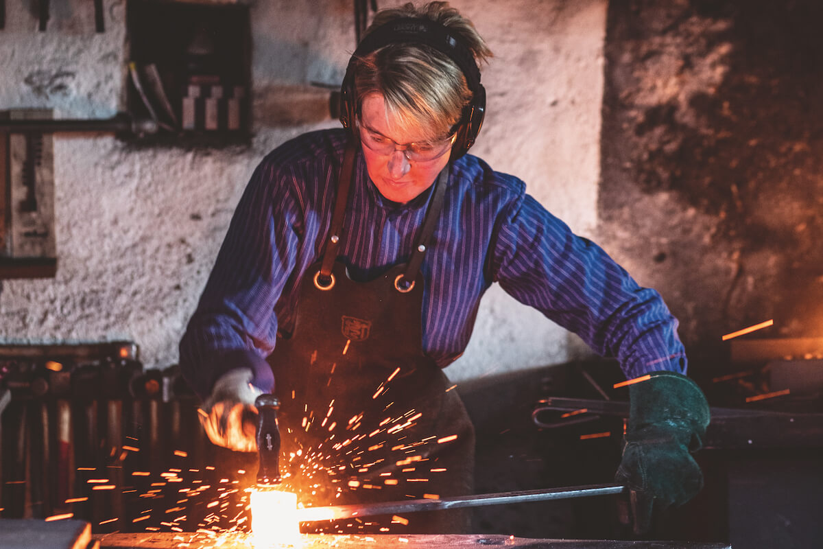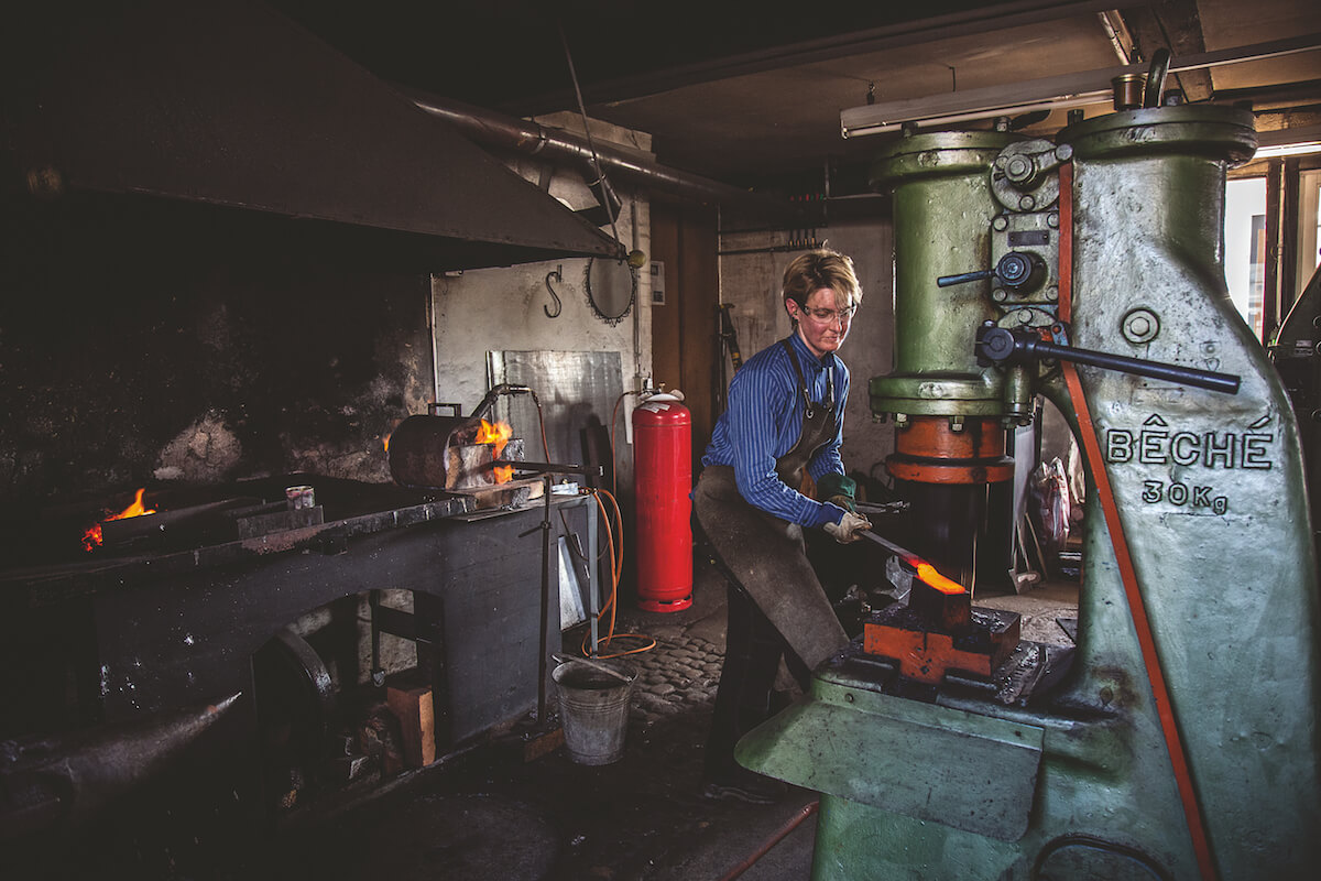 Zum Reden hat sie jetzt keine Zeit. Konzentriert schlägt Maja Zbinden gleichmässig mit dem Schmiedehammer auf das glühend heisse Metall. Funken stieben, grellharte Schlaggeräusche hallen durch den Raum. Dann bearbeitet sie das Metallstück mit einer groben Bürste, streut ein Pulver darüber und schiebt es zurück ins Feuer. In der Pulverdose sei Borax, ein Schmelzpulver, wird die Schmiedin später erklären. Doch jetzt…
