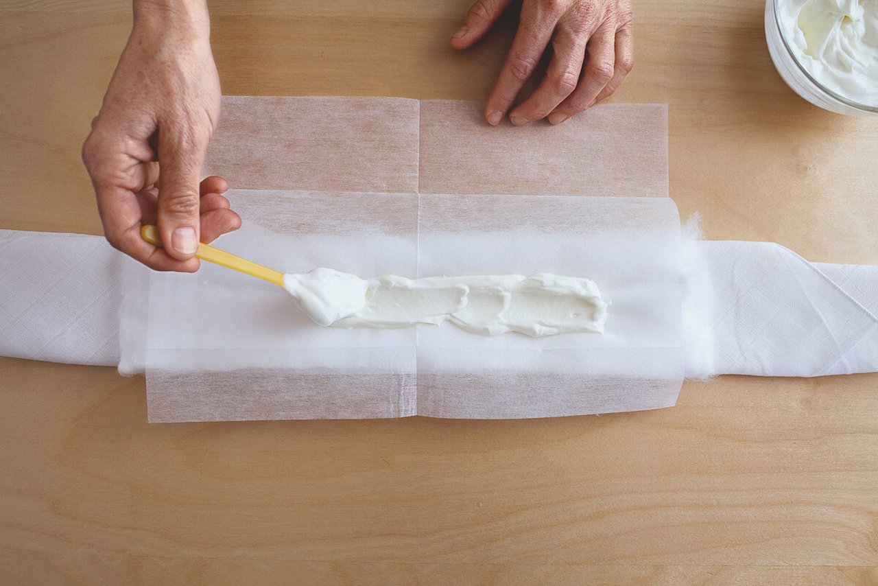 Material: Windeleinlagen aus Viskose, Haushaltpapier, Magerquark, Watte und Fixationsmaterial.