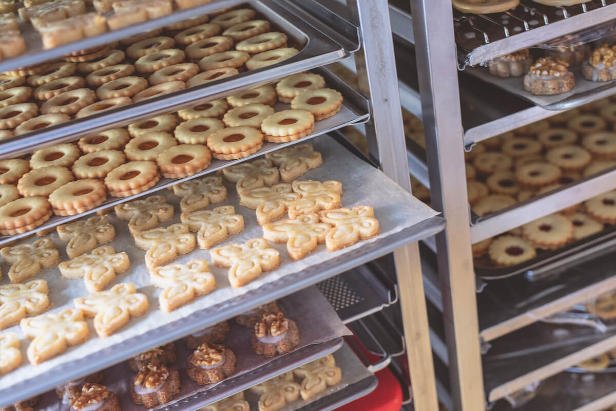 Schon vor der Tür zur Backstube läuft einem das Wasser im Mund zusammen: Güetzi-Duft wabert durch die Luft! Gleich hinter der Tür liegen auf zwei mannshohen Rollwagen gut 35 Bleche voll mit gluschtigem Kleingebäck, wie Kokosmakrönli, Schoggichugeli, Baumnuss-Güetzi oder Zitronenmöndli.