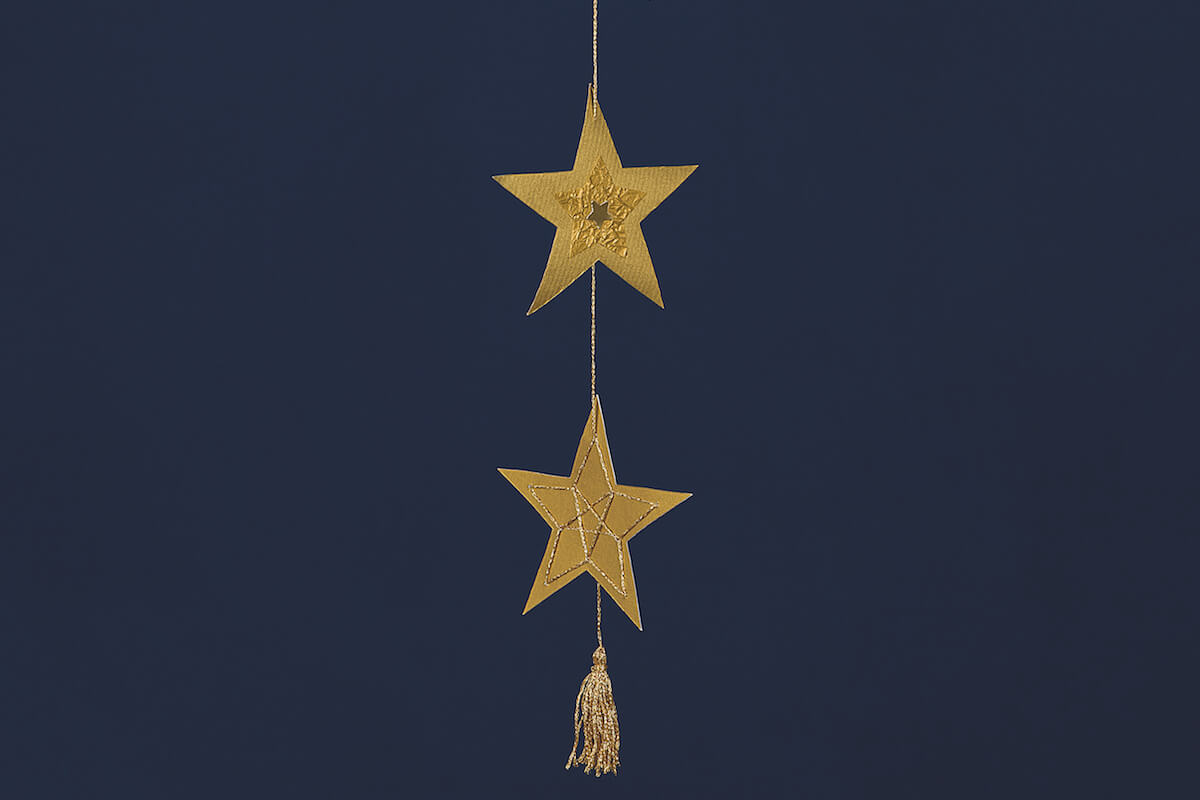 Zum Aufhängen die Sterne auf einen Lurexfaden auffädeln. Nach Belieben am Ende ein Glöckchen festbinden oder eine Quaste machen.