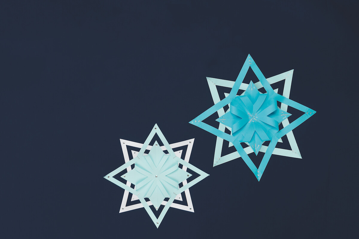 Verwendung: Im Raum- oder am Fenster aufhängen. Als Christbaum- oder Tischdekoration. Auf ein Kärtchen oder Geschenk kleben, dabei beim hinteren Stern die mittleren Zacken wegschneiden.