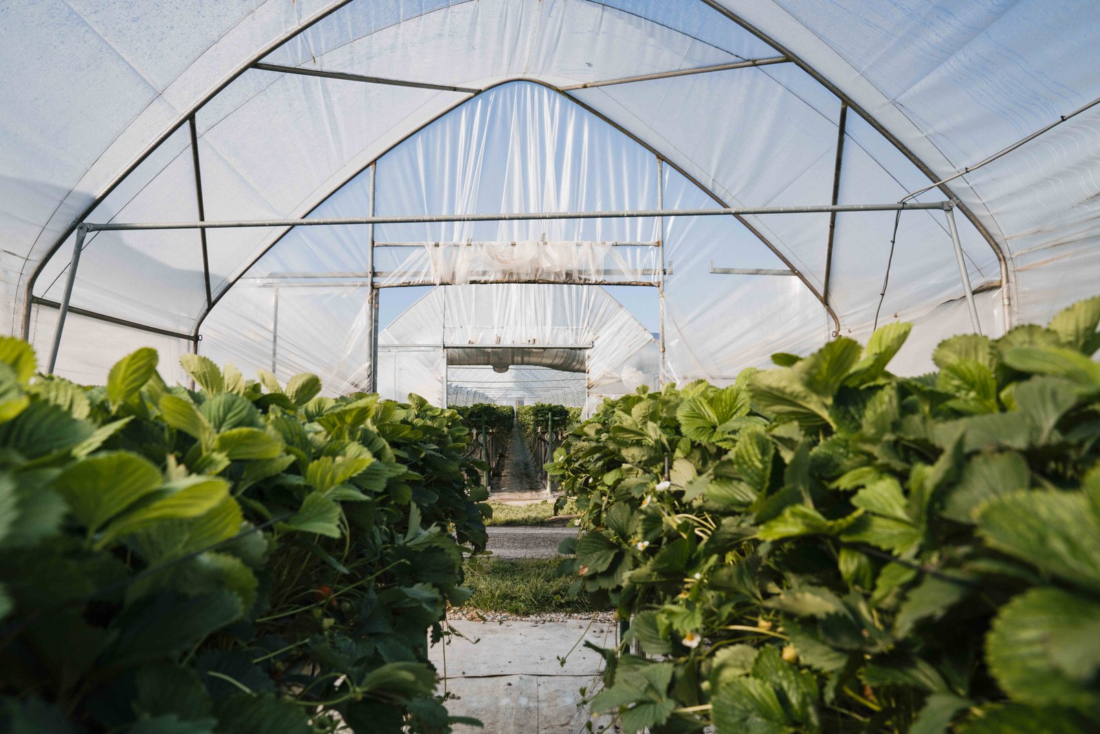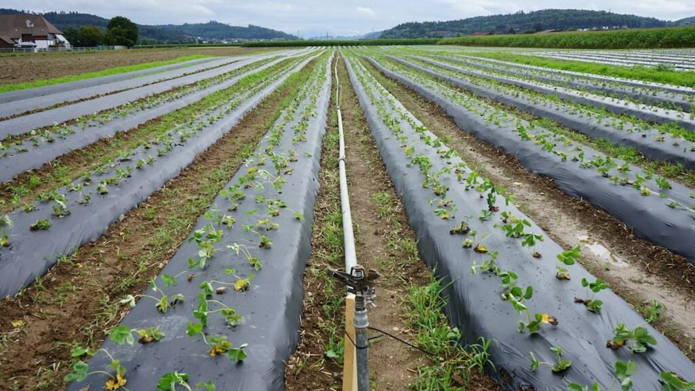 Erdbeeren wachsen im Freiland meist auf mit schwarzer Folie überzogenen Dämmen. Wenn andere Pflanzen in der Erde keimen, verbrennen sie in der Wärme der Sonne unter der Abdeckung. Bevor die neuen Erdbeersetzlinge gepflanzt werden, taucht man die Wurzeln in ein Bad. Darin enthalten sind Algen zur Stärkung der Pflanze, ein Fungizid als Schutz vor Pilzen und ein Wurzelaktivator, damit die Wurzeln rasch wachsen.