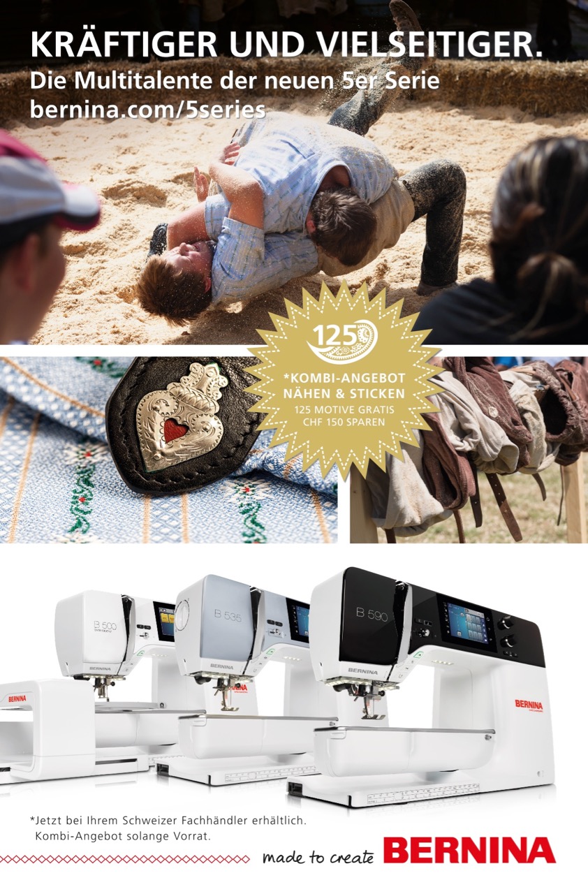 BERNINA Kunden profitieren jetzt vom Kombi-Angebot einer BERNINA 5er Serie mit neu entwickelten Stickmodul und sparen 150 Franken (Vorzugspreis gegenüber Einzelverkauf). Dazu gibt es über 125 trendige Jubiläums-Stick-Motive für Mode und Home-Dekoration geschenkt dazu. Das Angebot ist bei über 40 zertifizierten Fachhändlern in der Schweiz erhältlich (solange der Vorrat reicht).