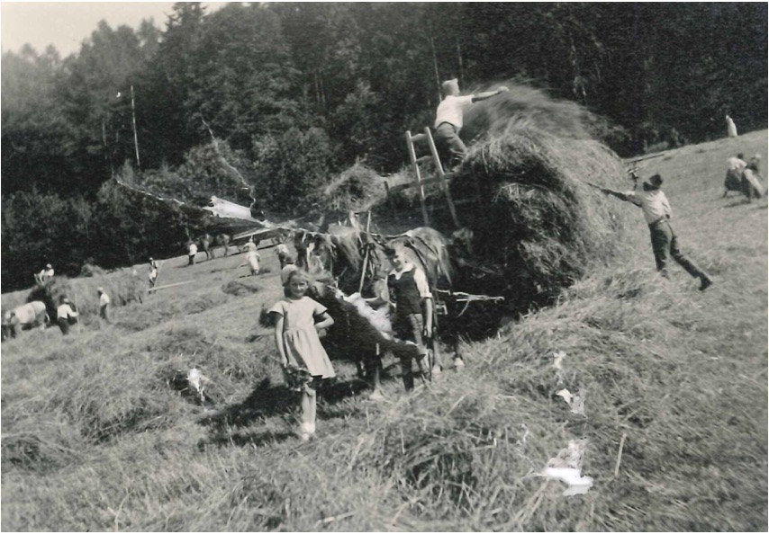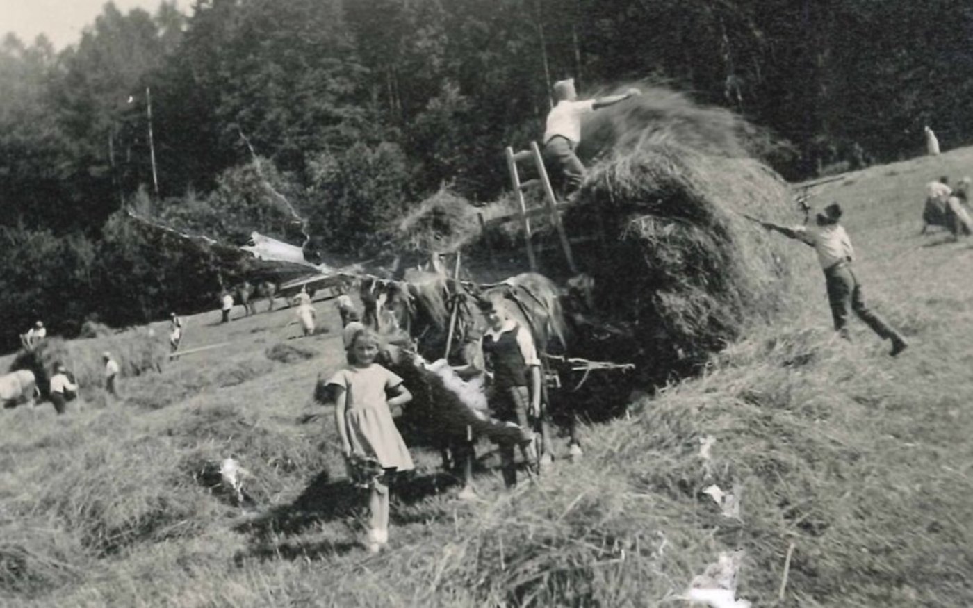 Während der Vegetation musste jeden Morgen eine grosse Mannschaft für die 90 Kühe das Gras auf den Feldern holen. Das seien immer drei Fuder gewesen. Mit der Sense habe man es zuerst mähen müssen, dann von Hand auf die Wagen laden. Damit es schneller ging, musste man die Sensen am Vortag gedengelt haben. «Um 7 Uhr mussten die Grasfuder jeweils vor den Ställen stehen», weiss Hans Schmid noch. Der Verwalter habe in dieser Zeit viel kontrolliert. Und wehe, die drei Fuder Gras standen vor dem Morgenessen nicht an ihrem Platz. Da es in der alten Scheune noch kein grosses Tenn gab, mussten die Melker das Gras jeweils von Hand hineintragen. [IMG 4-5]