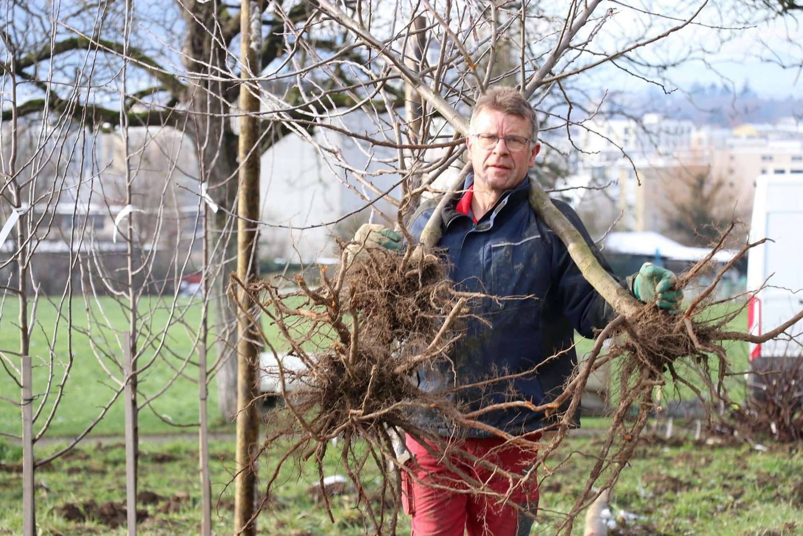 Trotz frostigem Wintermorgen friert hier keiner, denn die Arbeit ist anstrengend und das Tempo hoch. Meterlange Holzstangen werden über das Feld getragen, ein Bagger rammt sie in den Boden. Auf einer fahrbaren Hebebühne befestigen zwei Männer Ankerseile. Andere messen Abstände aus, graben Löcher, setzen Bäume ein. Und bereits nach dem Mittag ist das Werk vollbracht: Eine rund 1200 Quadratmeter grosse…
