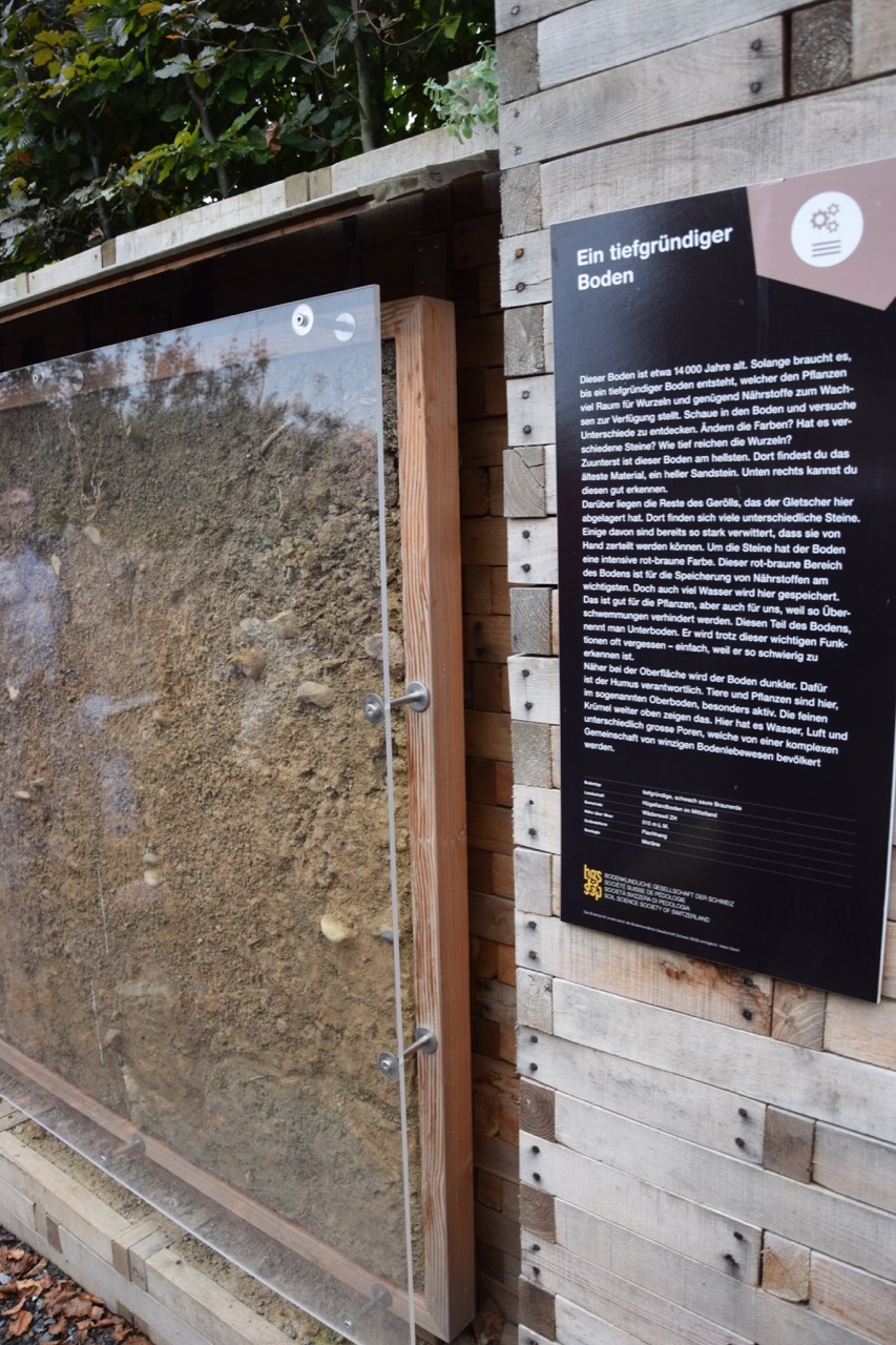 Wer es ruhiger mag, kann am gleichen Ort die Ausstellung «Erdreich» besuchen. Diese rückt die wertvolle Ressource Boden ins Zentrum. Sie zeigt, wie langsam Böden entstehen, welche Eigenschaften und Funktionen sie haben, wie vielfältig ihre Bewohner sind, usw. «Erdreich» kann selbst begangen (gratis) oder in einer Führung besucht werden. Für Schulklassen gibt es Lerneinheiten für alle Schulstufen, in denen sie unter Anleitung Bodenproben nehmen und analysieren können.