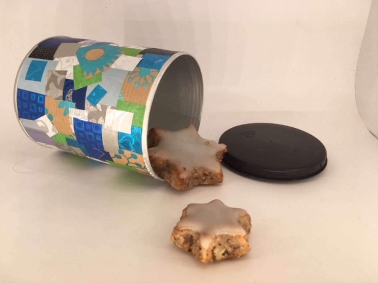 Was man immer mal im Haushalt hat, sind kleinere Kartonschachteln. Aus einem schlichten Kistchen wird dank farbigem Geschenkpapier eine kleine Schatztruhe. Das funktioniert auch gut mit Dosen (etwa von Bouillon- oder Saucenpulver). Eine Dose zu bekleistern ist sogar noch etwas einfacher, da sie keine Ecken hat.