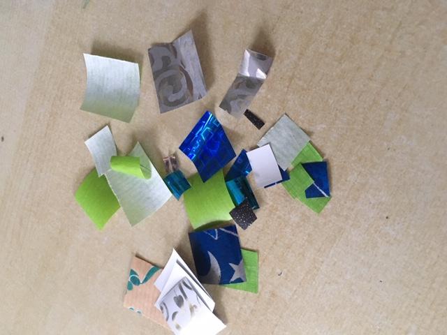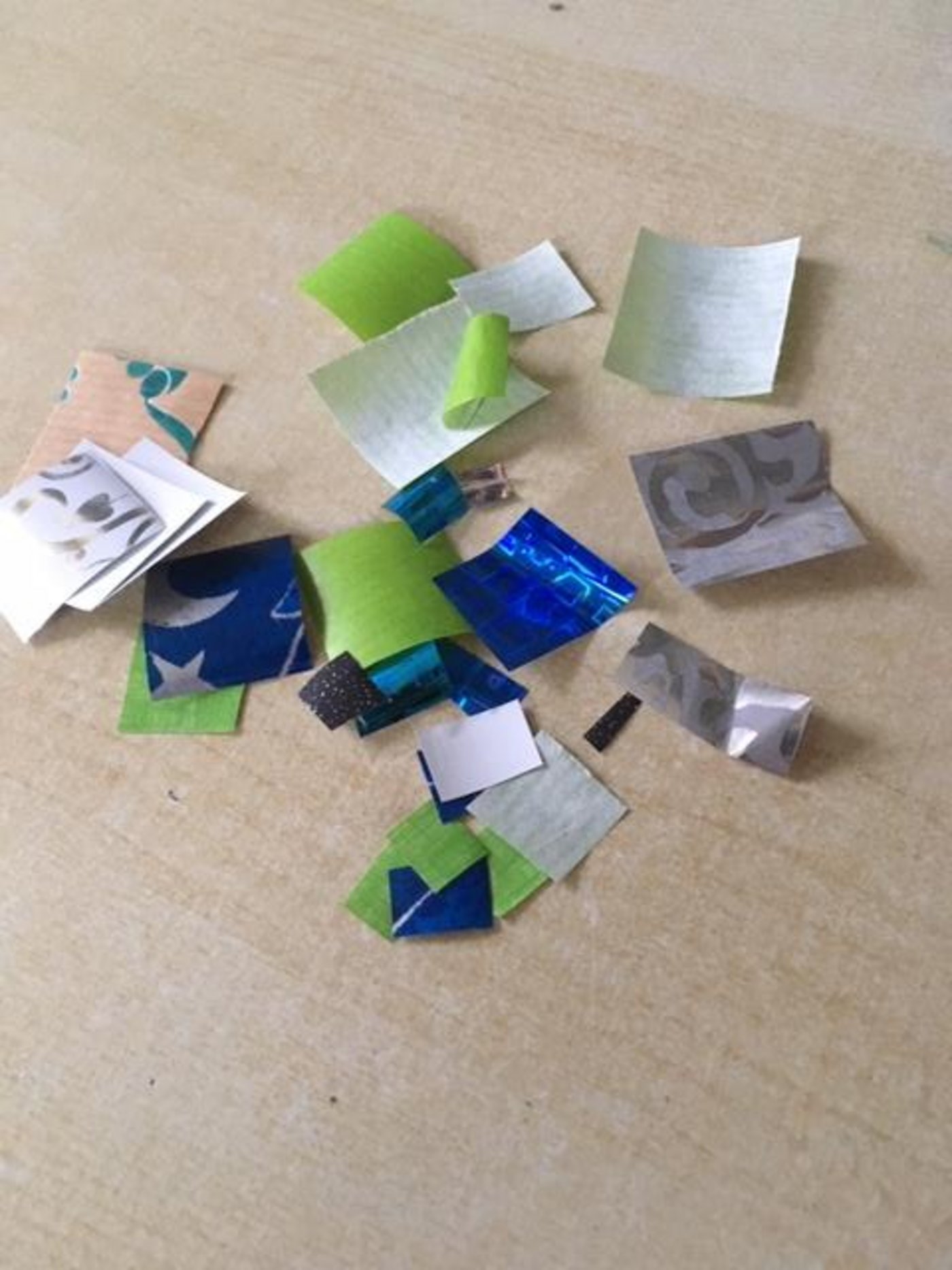 1. Geschenkpapier mit verschiedenen Farben und Mustern in kleine Quadrate schneiden. Ist das Papier eher fest, sind kleinere Quadrate einfacher zum Aufkleistern. Wer mag, kann auch Kreise oder Sterne ausschneiden.