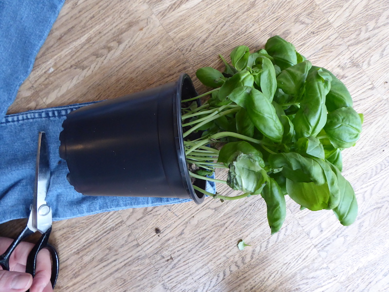 - Abschneiden und das Stück Hosenbein-Schlauch mit dem Beinsaum nach oben über den Topf ziehen.