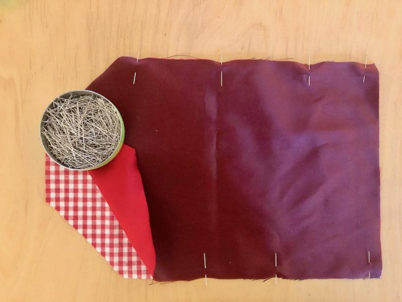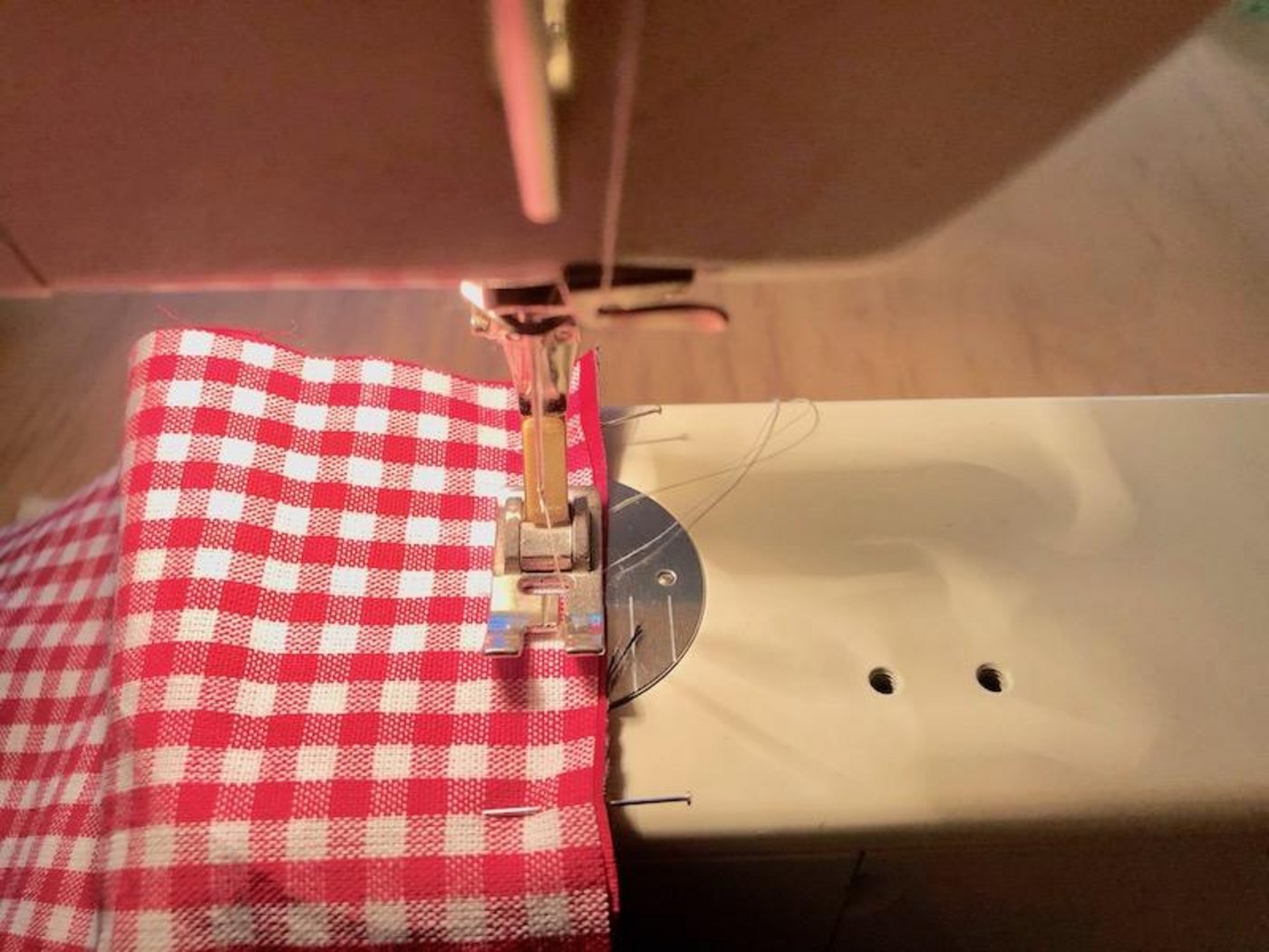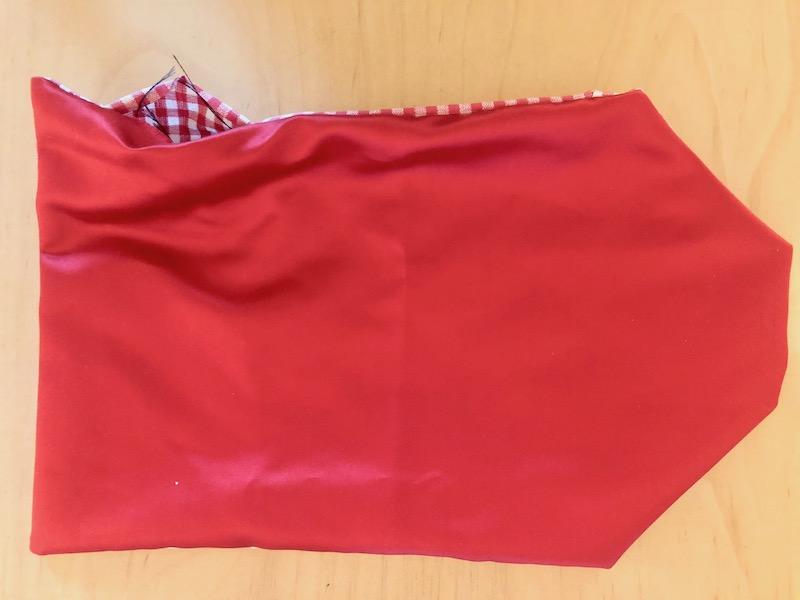 3. Die beiden Stoffteile, rechte auf rechte Seite legen, zusammenstecken und füsschenbreit, bis auf eine Wendeöffnung von zirka 6 cm auf der einen Längsseite, zusammennähen.