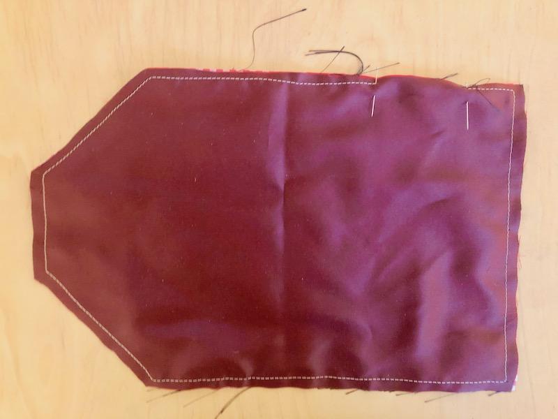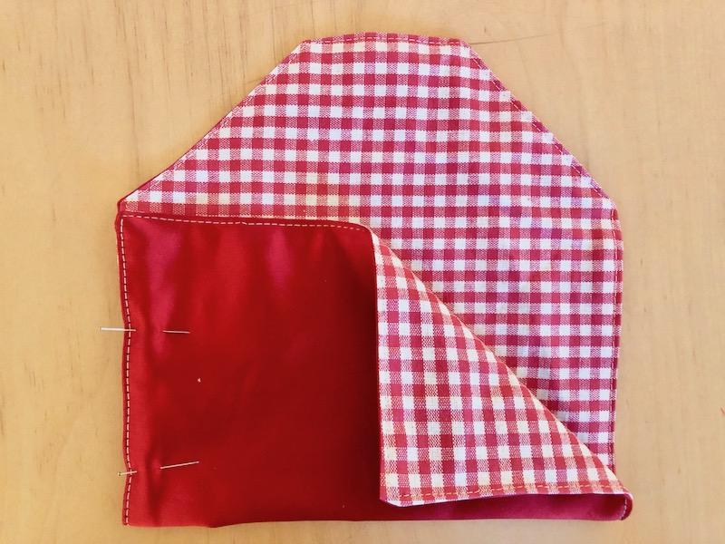 6. Die unteren beiden Ecken bis zur Stelle hochklappen, an der der Stoff schmaler wird. Auf einer Schmalseite zusammennähen.