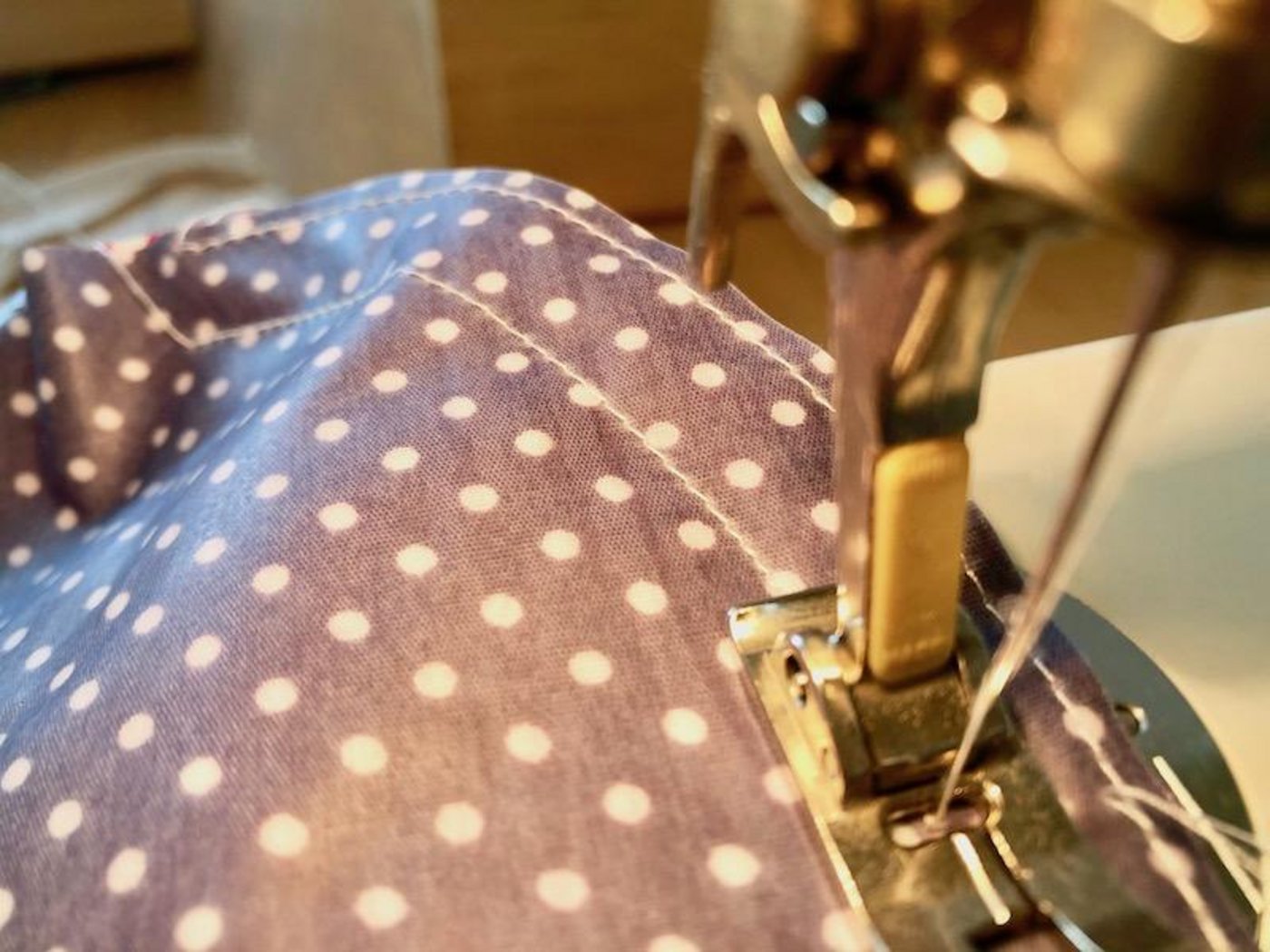 4. Zweimal absteppen. Erstes Mal zirka 2 mm vom Rand weg. Zweites Mal, je nach Gummibandbreite, 1 bis 1,5 cm ab erster Naht. Jeweils eine Öffnung von zirka 1 cm stehen lassen.