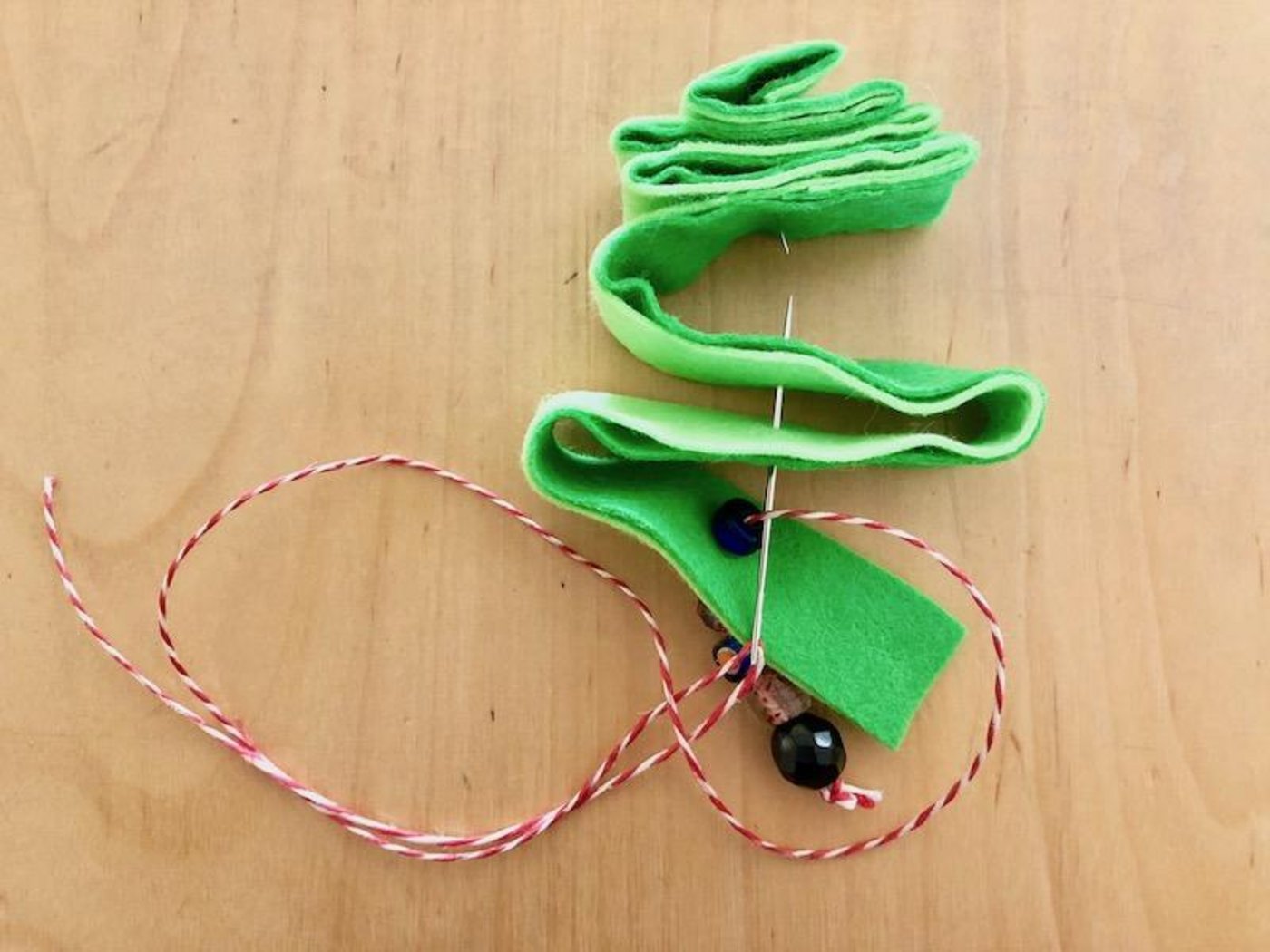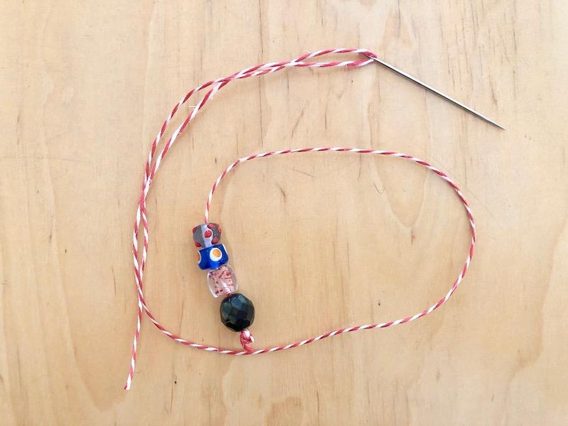 3. Am Fadenende einen grossen Knopf machen und ein paar Glaskugeln für den Stamm aufziehen.