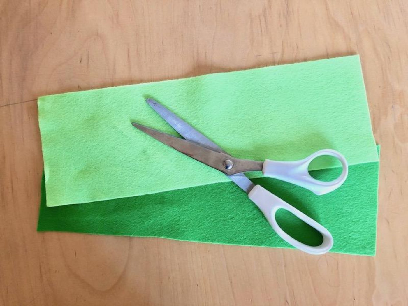 1. Je zwei unterschiedlich farbene Filzbahnen aufeinander kleben. Eventuell Bahnen in der Länge zusammensetzen, wenn der Filz nicht sehr lang ist.