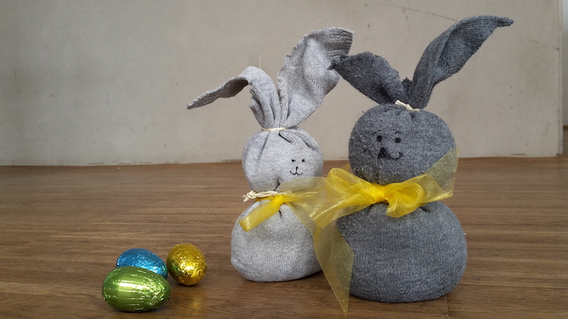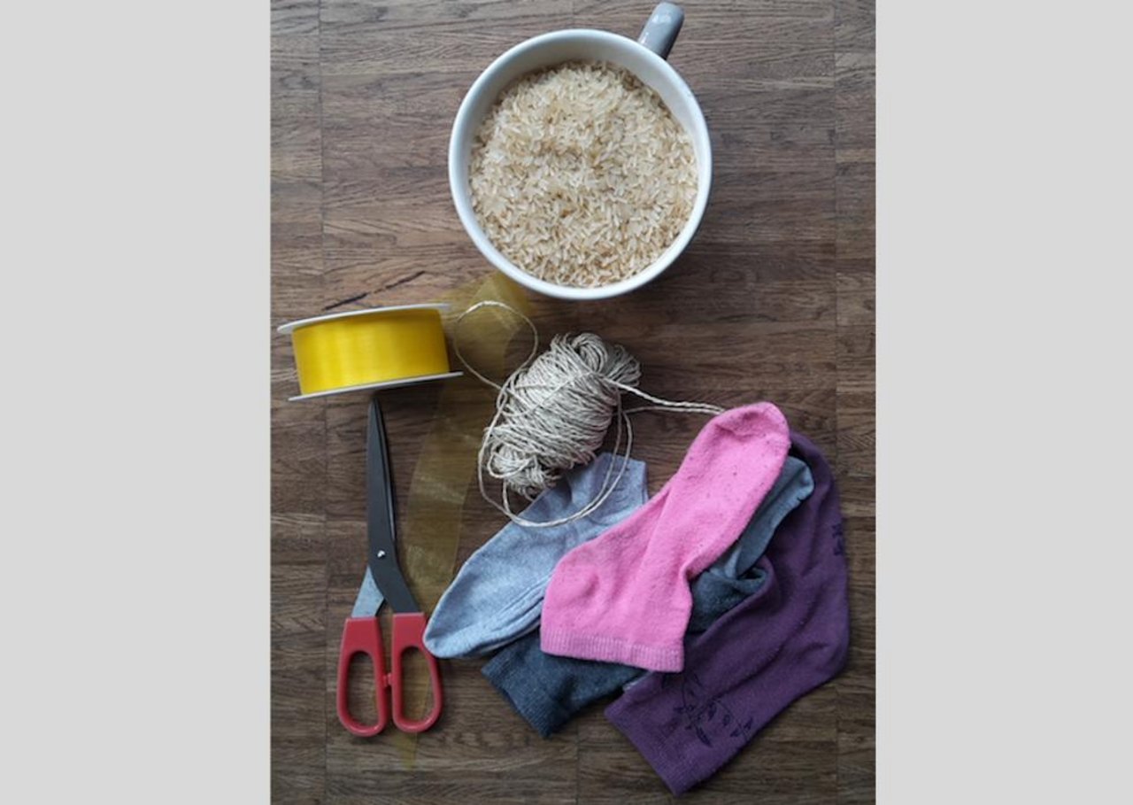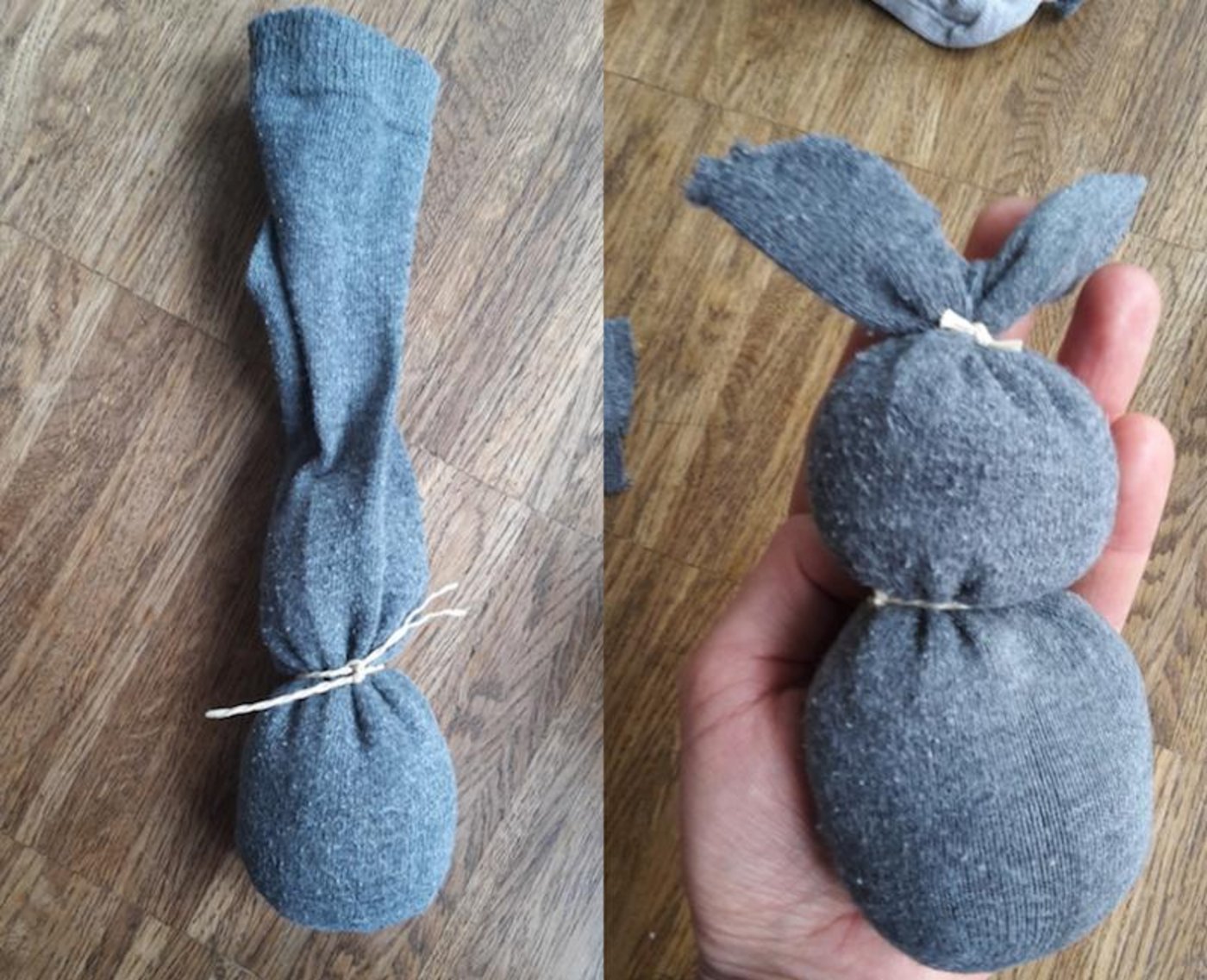 - Socke mit Reis oder Körnern füllen, etwa zur Hälfte bzw. bis zum Fersenteil. Das Häschen vor sich hinsetzten und zurecht knuffen, sodass es nach Bauch und Kopf aussieht.
