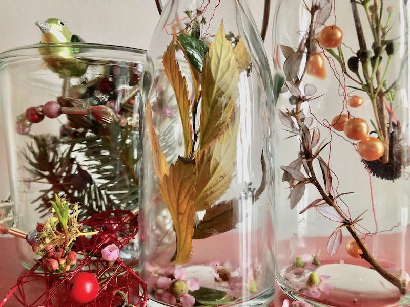 - Die Gläser und Bügel-Flaschen mit Zweigen und Blütenständen befüllen.