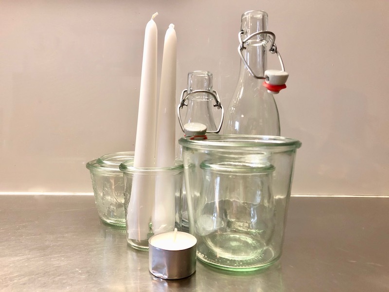 Tipp: Die gefüllten Flaschen als Kerzenständer verwenden. Einzelne kleine Einmachgläser nur mit Rechaud-Kerzen befüllen und wie Teelichter verwenden.