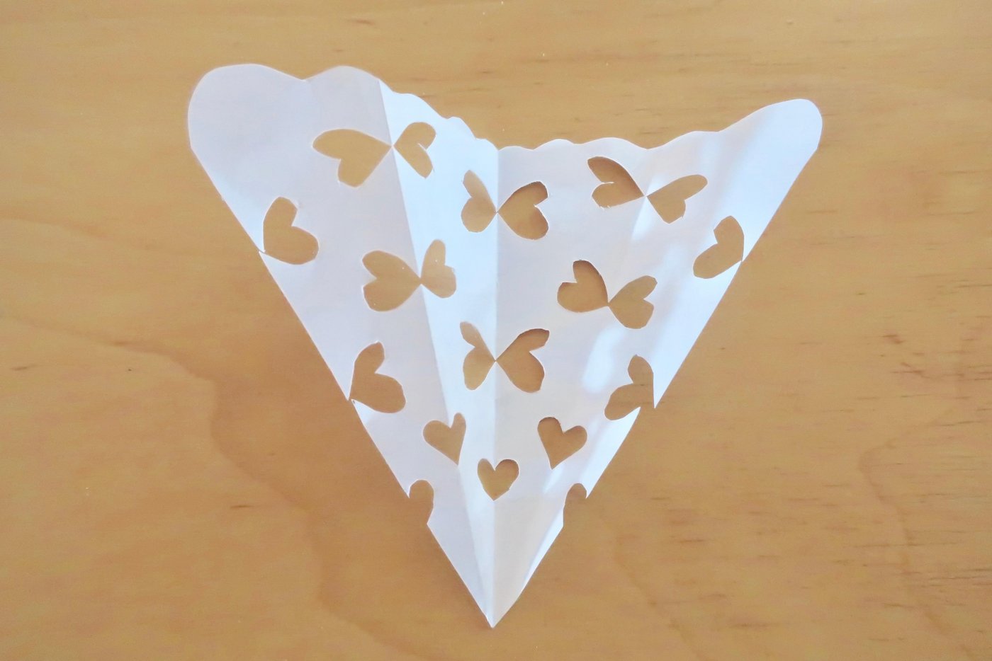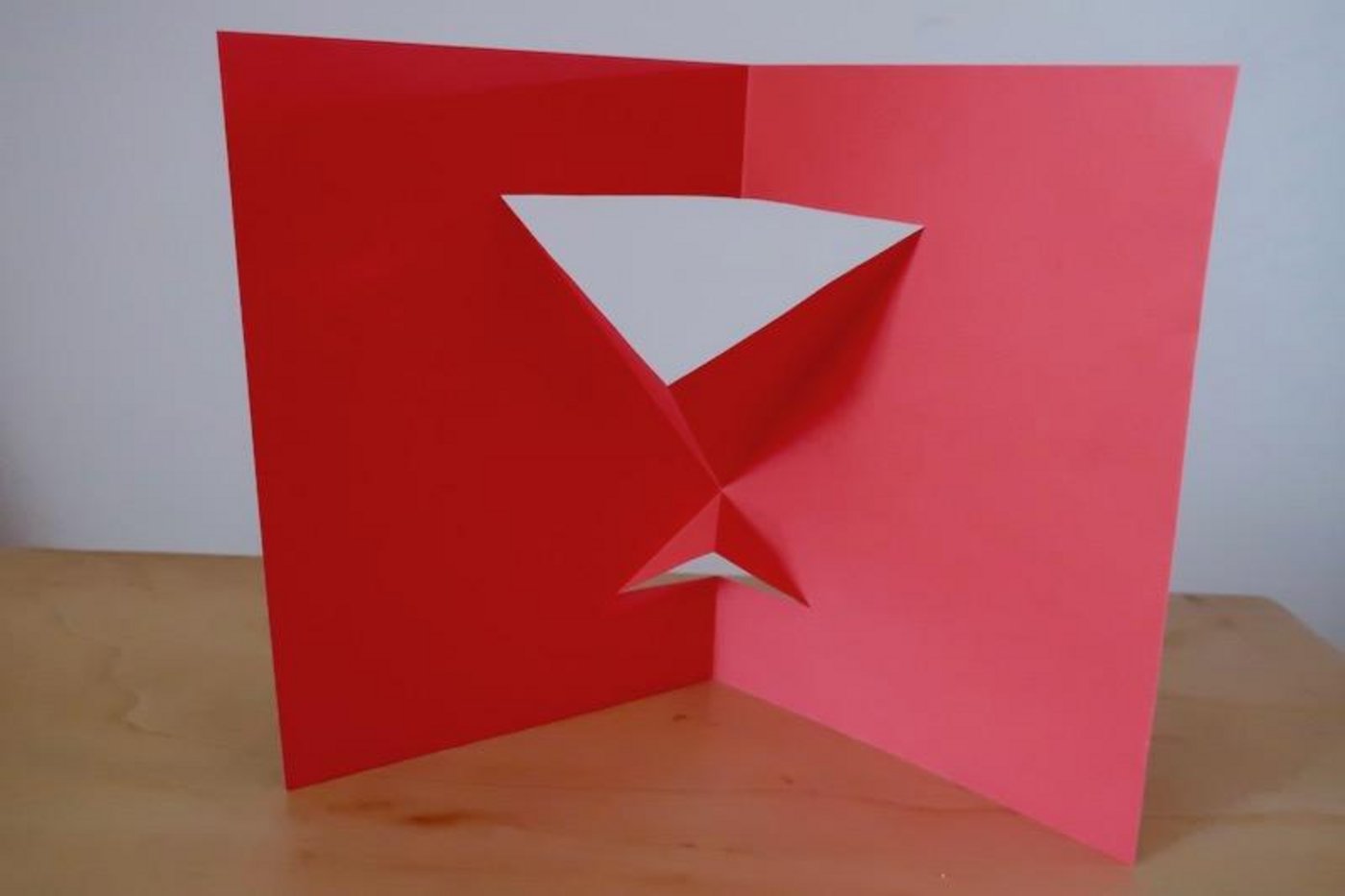 Je die Linien, die rechteckig zum Falt eingezeichnet sind, einschneiden, den diagonalen Strichen nach falten, dann die Karte öffnen und den beweglichen Kelch gegen sich umbiegen.