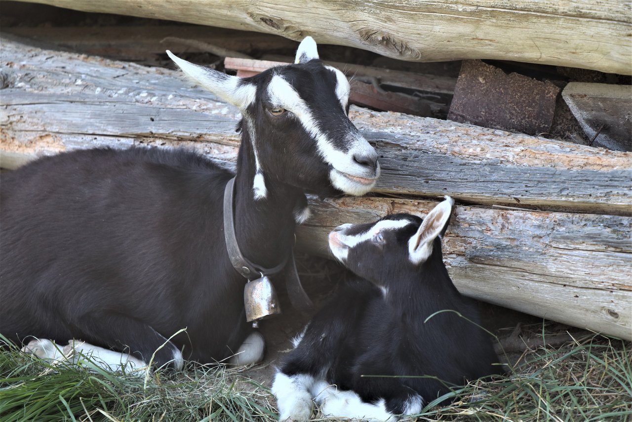 Dann gibt es halt auch mal ein Gitzi mitten im Sommer. «Das Kleine hat sich sehr gut in die Herde eingefügt. Man bemerkt es eigentlich kaum», sagt Elisabeth. Gerne klettert es auf seiner gutmütigen Mutter herum oder legt sich zu anderen Ziegen hin, sozusagen zu seinen Tanten. Geiss Blüemli mag es besonders gerne, vielleicht, weil Blüemli mit ihren 10 Jahren bereits die Würde einer Grossmutter ausstrahlt. Saugen tut das Kleine erstaunlicherweise ausschliesslich bei seiner Mutter. «Würde es auch bei anderen Ziegen trinken, würde ich das beim Melken sofort anhand der geringeren Milchmenge merken», sagt die passionierte Ziegenzüchterin.